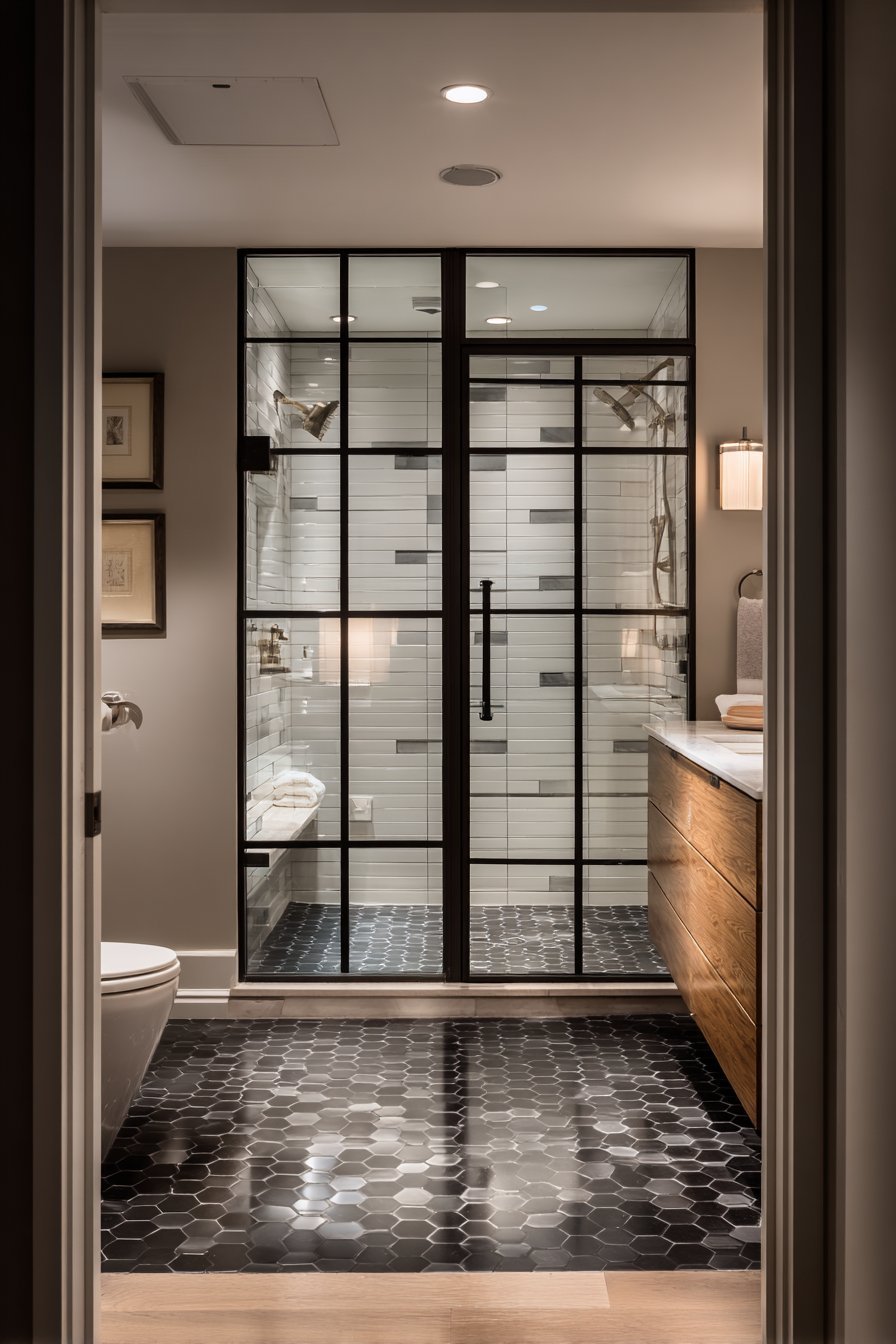 - Balance bold framing with simpler tile and fixture selections