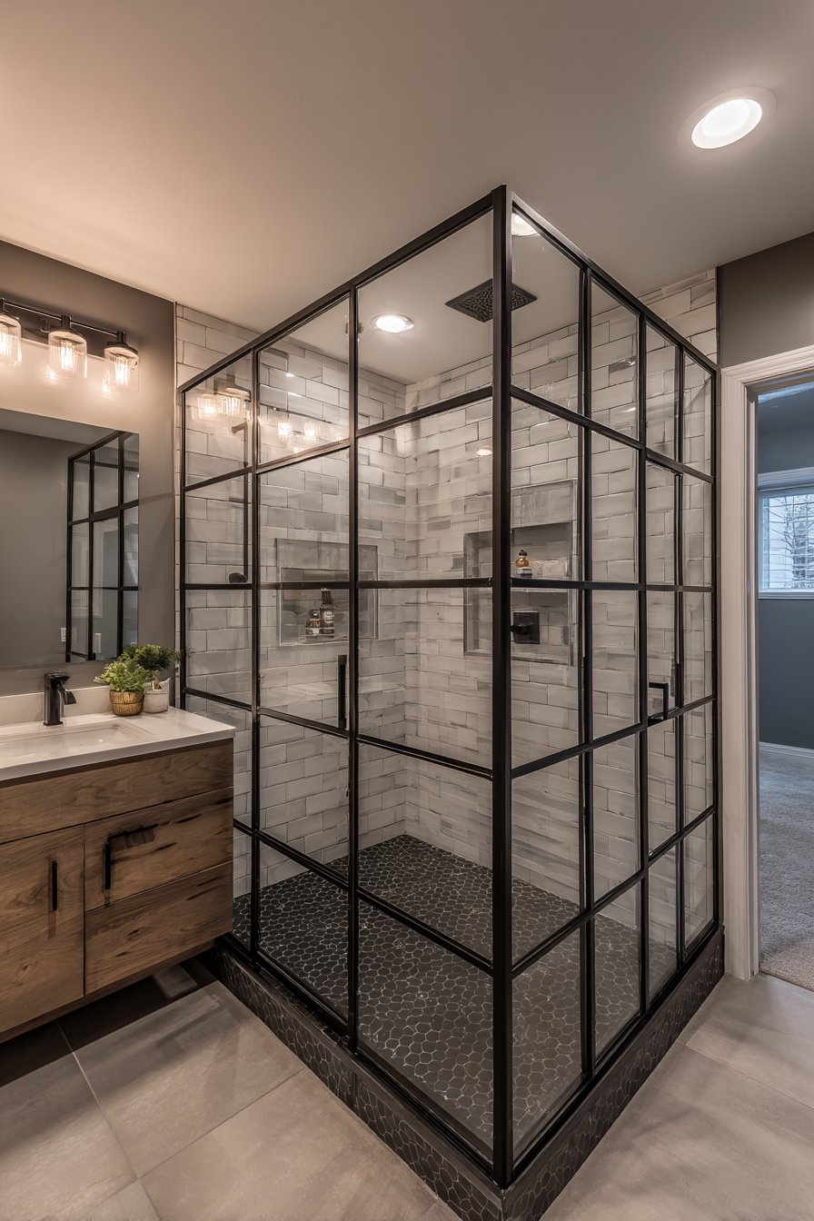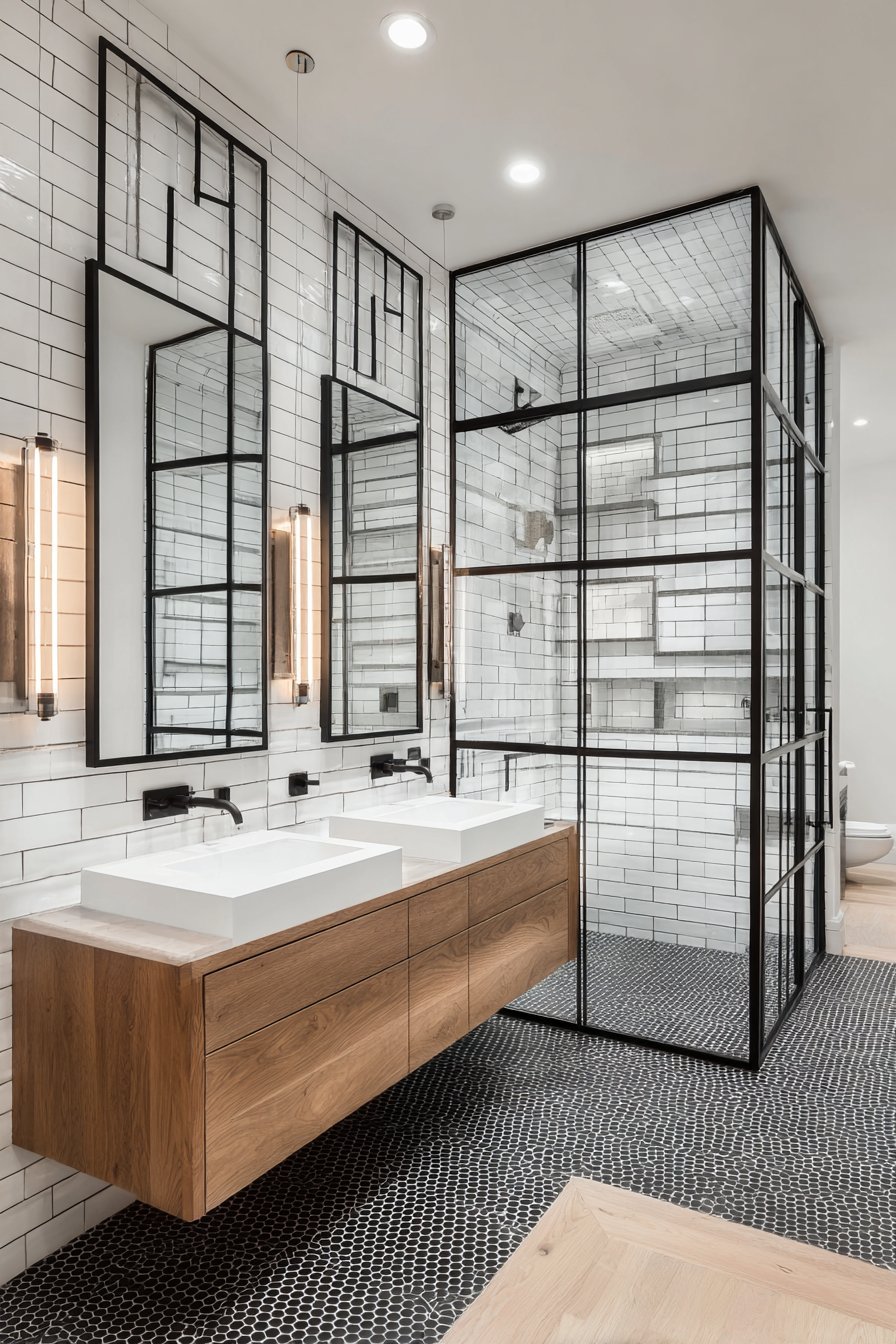Black-framed glass shower enclosure features geometric grid pattern in metal framework. Clear glass panels set into matte black aluminum create contemporary cage aesthetic. White subway tile and black hex floor tile provide high-contrast backdrop. Floating double vanity in white oak balances the bold shower enclosure.