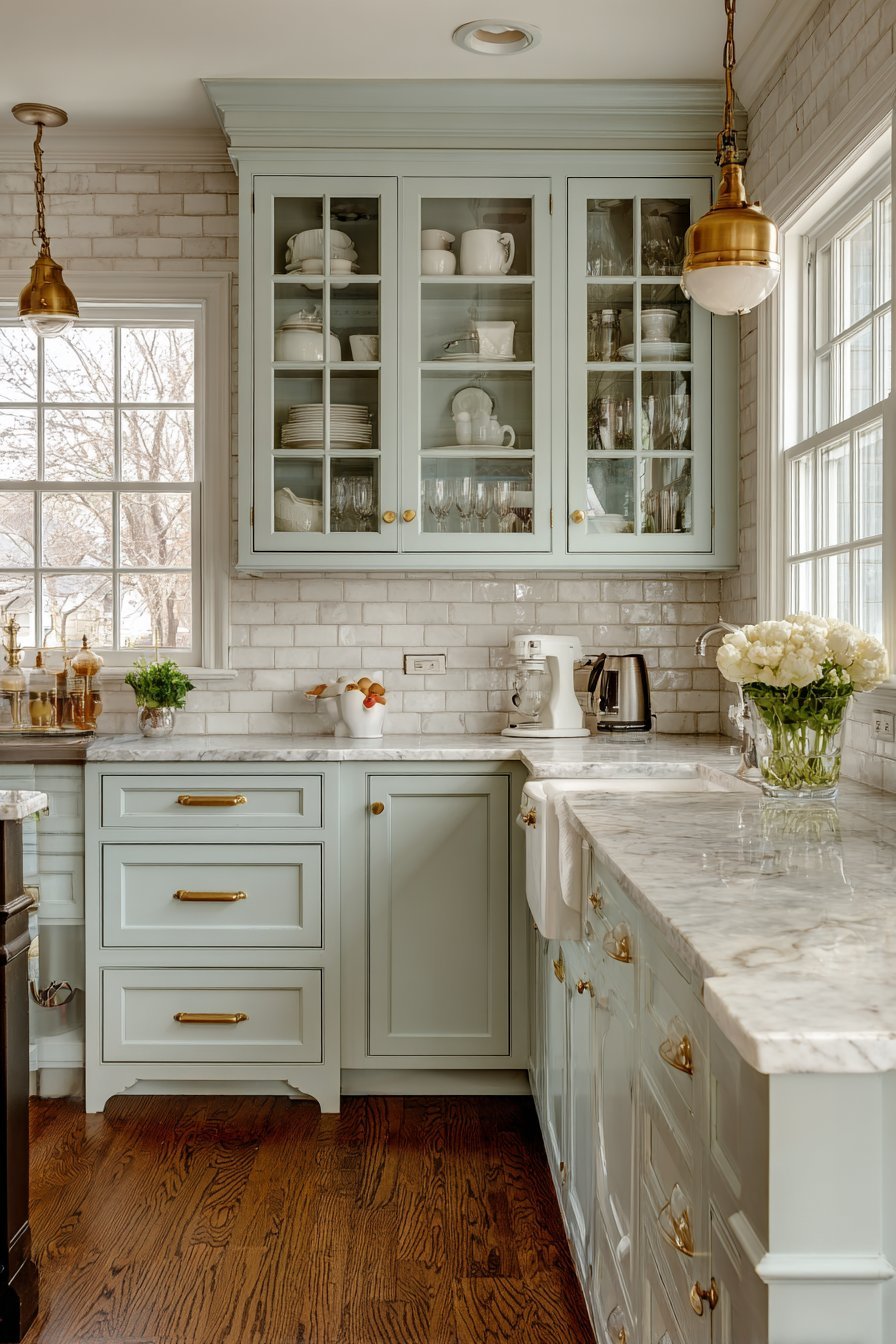 Brass hardware adds warm metallic notes that complement the sage green beautifully. White subway tile backsplash provides classic contrast against the colored cabinetry. Marble countertops complete the refined aesthetic with natural stone elegance. The glass cabinets encourage organization, as contents remain visible at all times.
