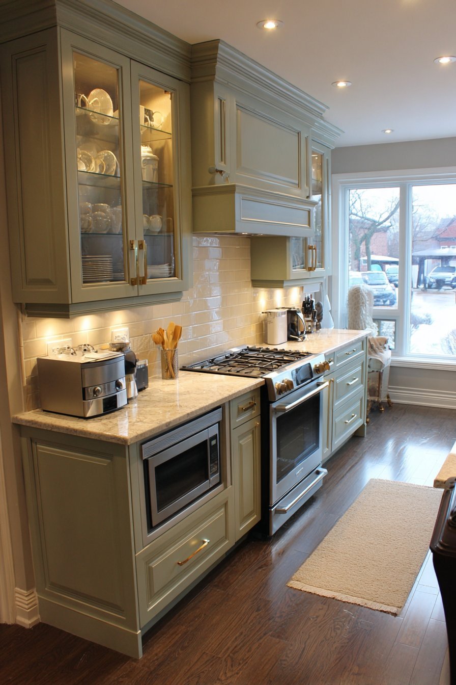 Glass-fronted cabinet doors transform kitchen storage into beautiful display opportunities. Soft sage green paint on traditional raised-panel frames creates timeless appeal. Clear glass inserts reveal organized white dishware and glassware collections. Under-cabinet lighting illuminates the glass-fronted sections, creating depth and visual interest after dark.