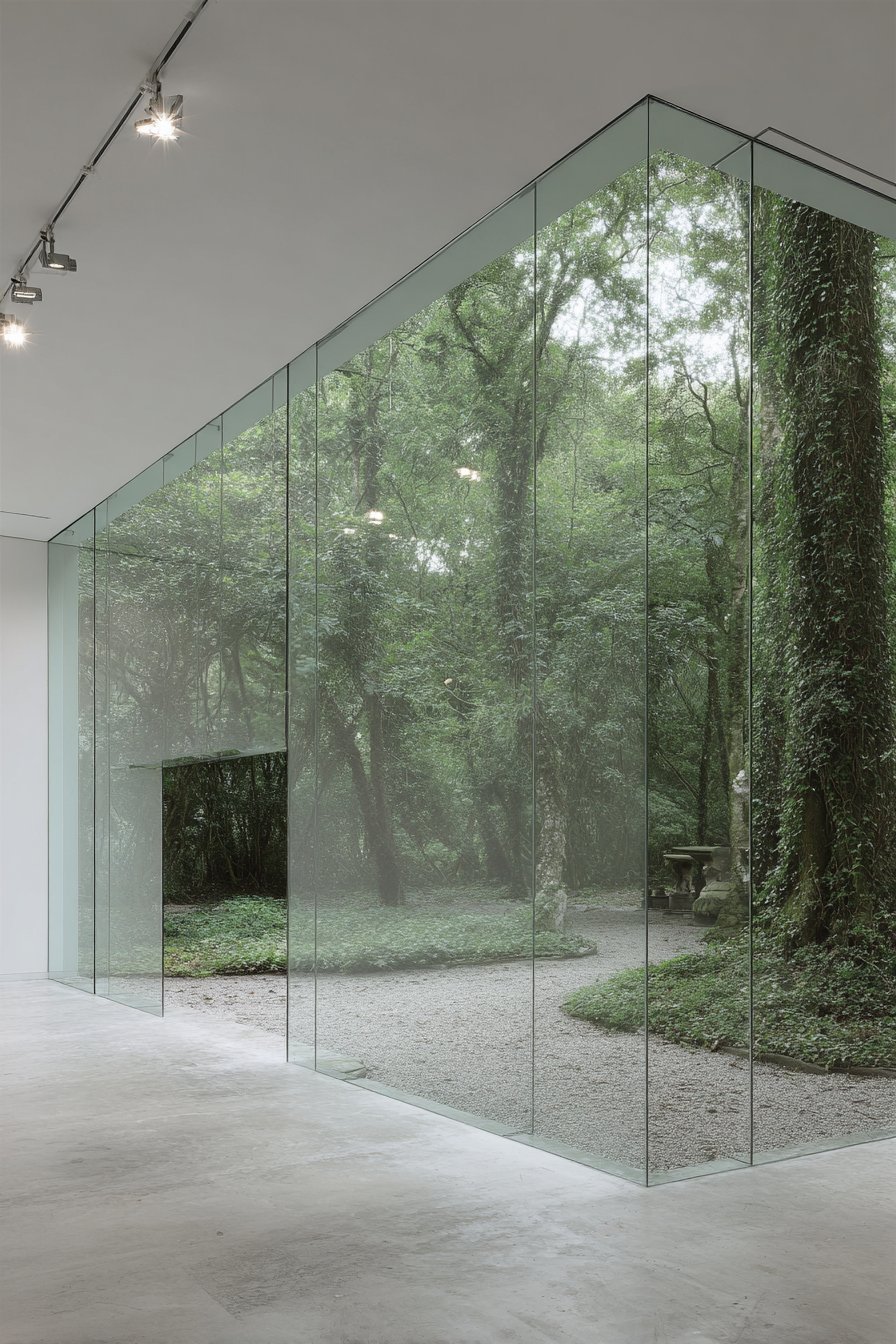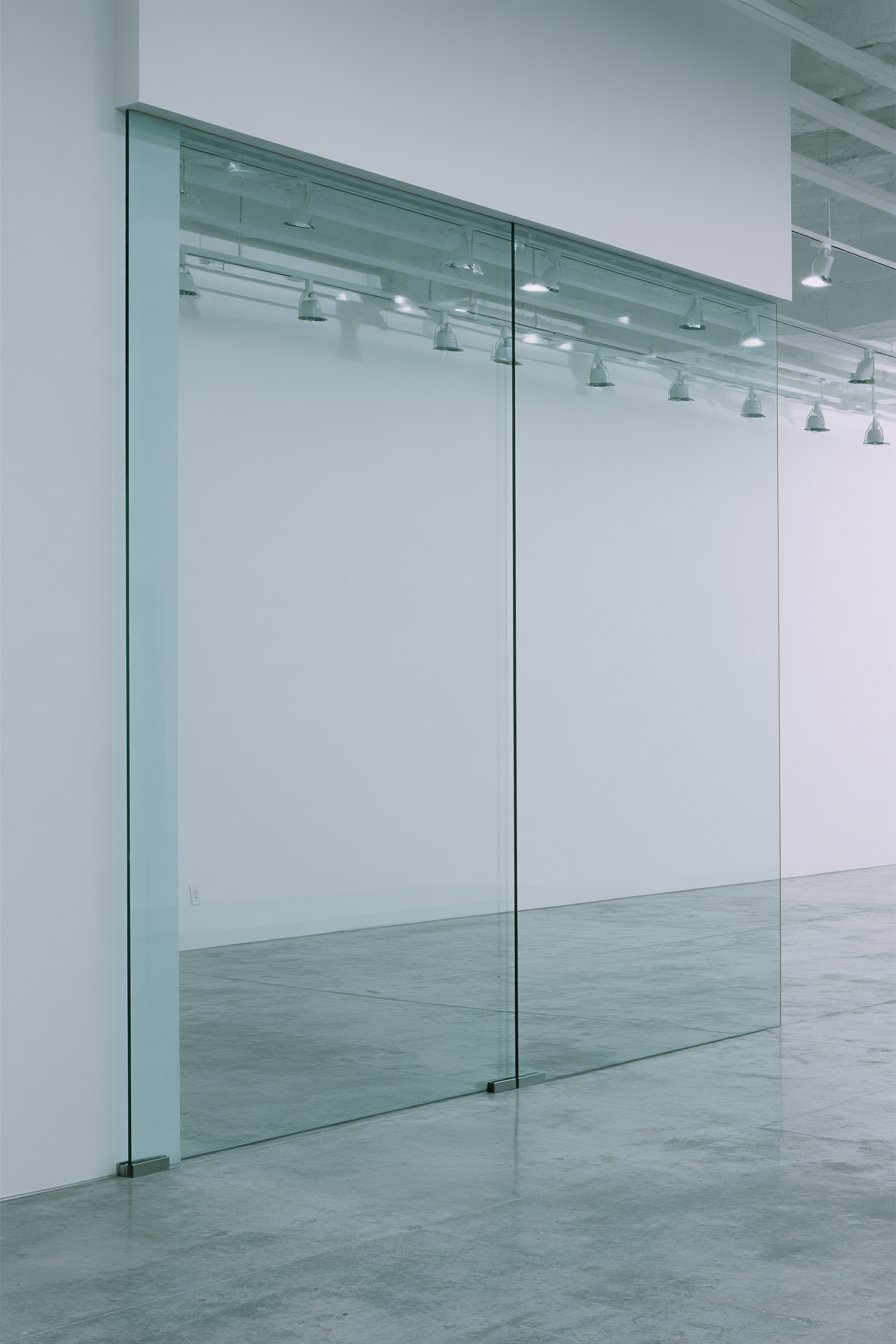 Oversized glass sliding door system features minimal white aluminum frames. The twelve-foot wide doors open to private sculpture garden spaces. Polished concrete floors and white walls create neutral gallery backdrop. Track lighting supplements abundant natural light flooding the studio.