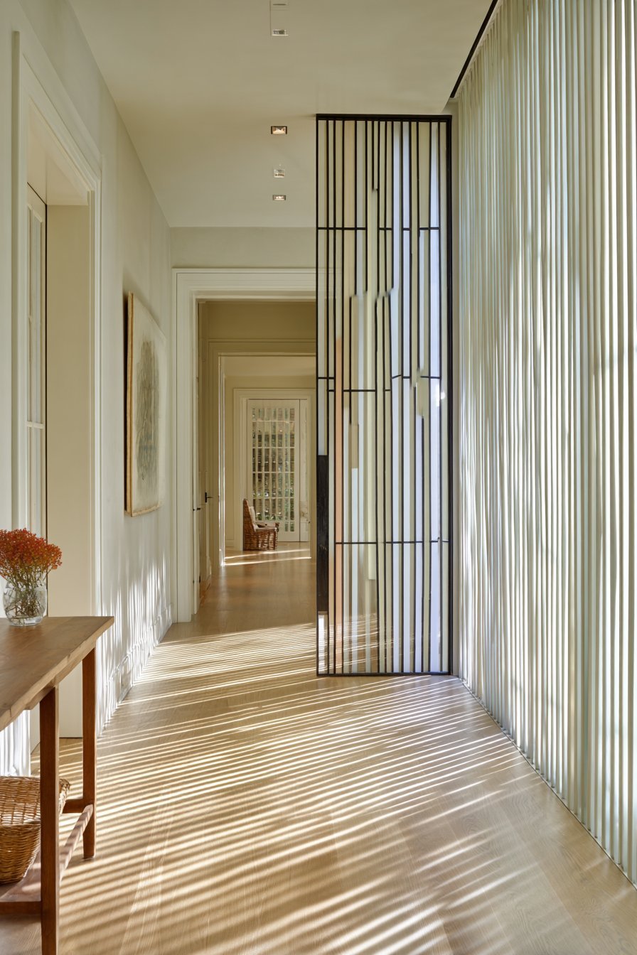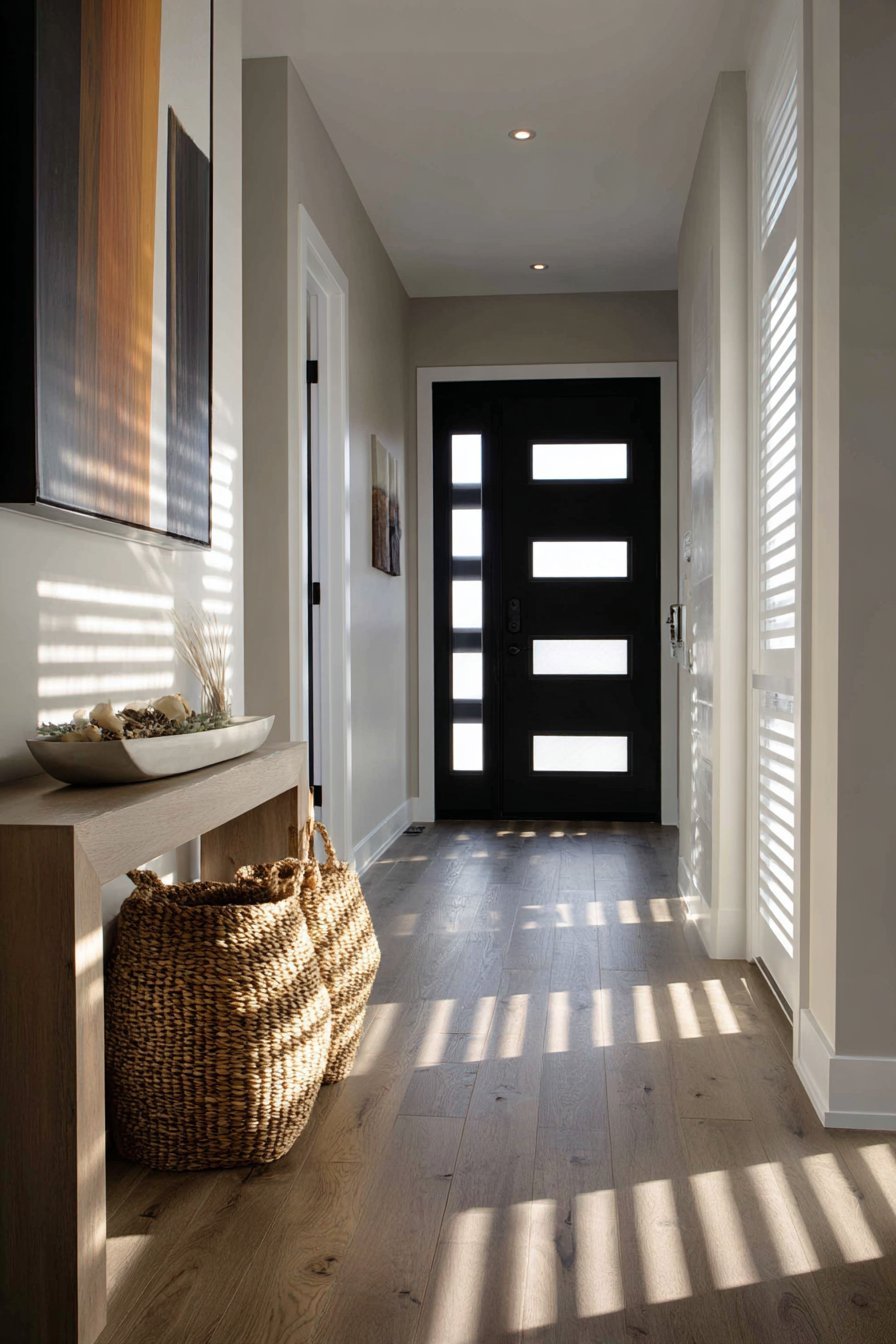Light wood console table and woven basket storage maintain the Scandinavian simplicity. Warm white walls reflect filtered daylight throughout the narrow entry hall. The geometric striping creates interesting shadow patterns on oak flooring. Morning light transforms these patterns throughout the day as sun angles shift.