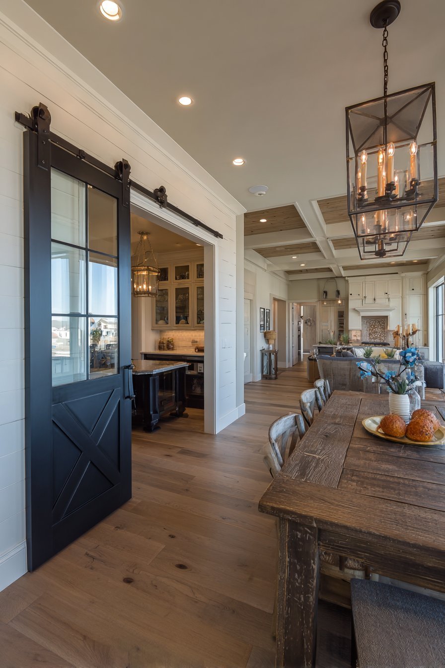 A glass-paneled barn door perfectly bridges modern and farmhouse aesthetics. Eight individual glass panels sit within black painted wood frame with X-brace detail. The door slides on black metal hardware track, separating dining area from butler’s pantry. This functional element becomes a striking design feature.