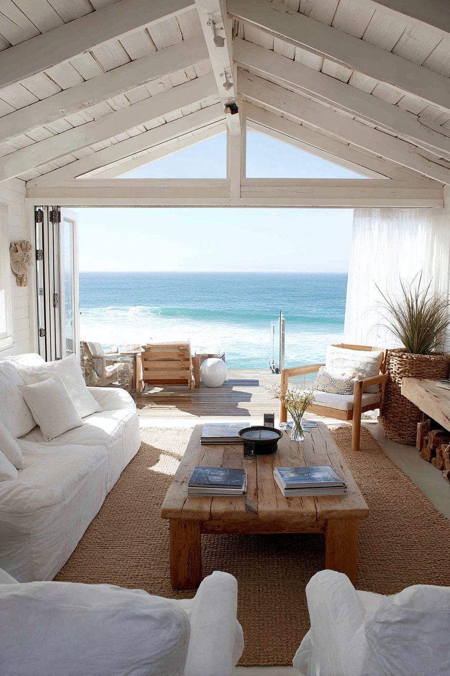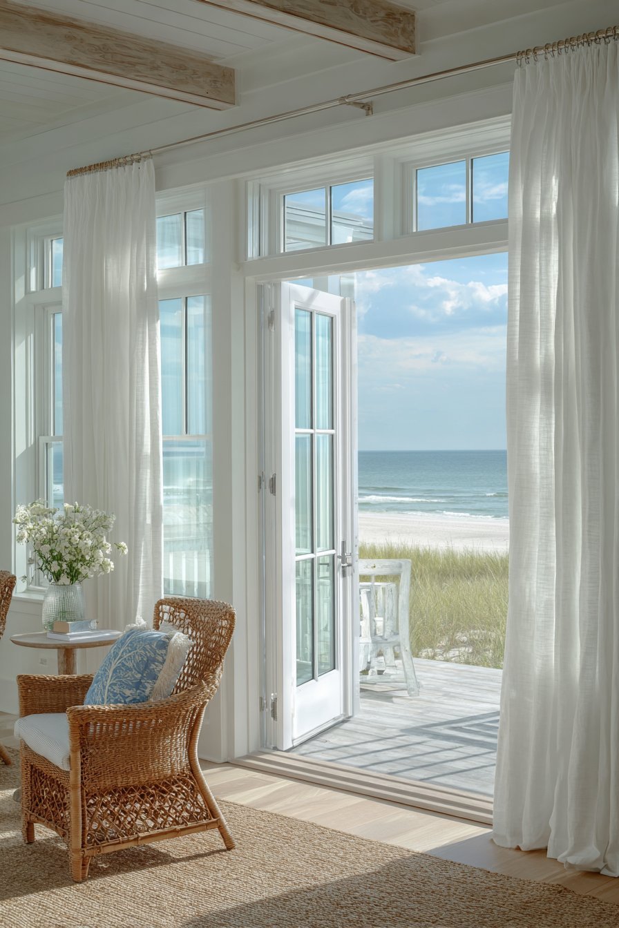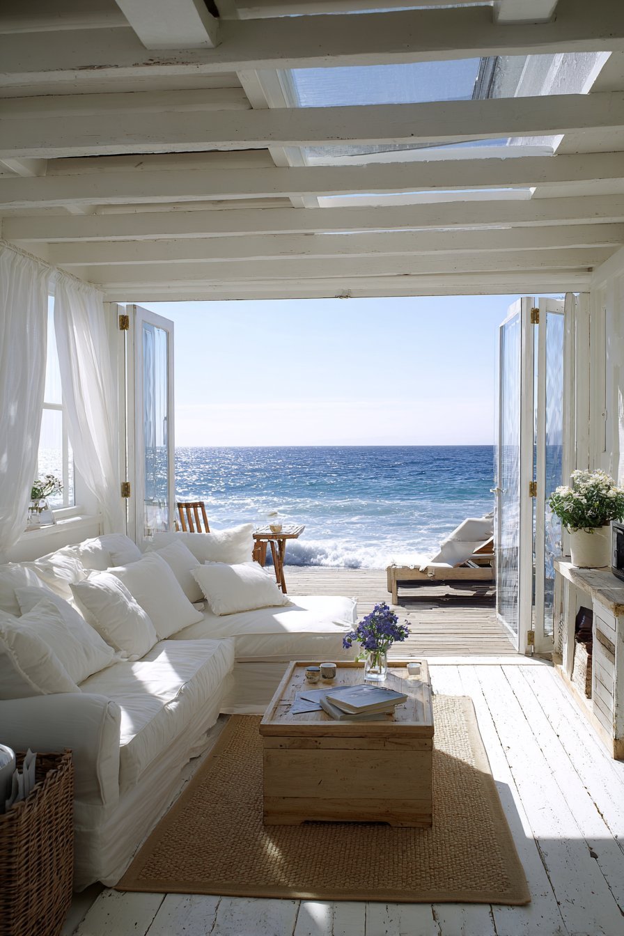 Sheer white curtains frame the opening, moving gently in ocean breezes. The indoor-outdoor flow feels effortless when doors stand fully open. During inclement weather, the transparent closure maintains ocean views. The white frames keep the aesthetic light and maintenance-free over years of exposure.