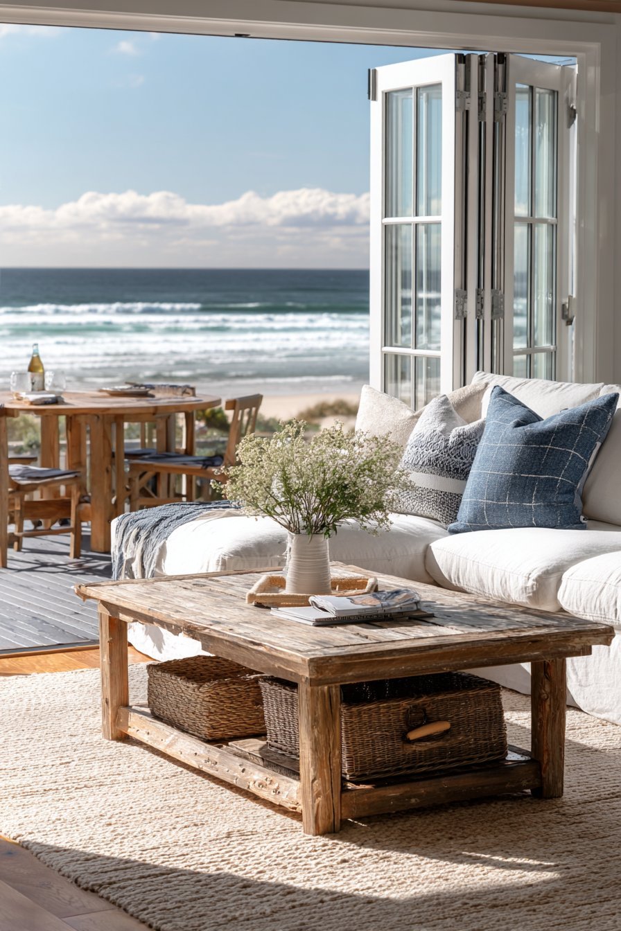 Bi-fold glass doors create transformative connections to outdoor living spaces. White aluminum frames resist salt air corrosion in coastal environments. When opened, the doors stack completely to one side, creating an unobstructed wall opening. Natural fiber rug and whitewashed wood furniture complement the breezy coastal aesthetic.