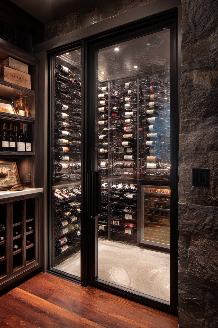 The glass door serves multiple purposes beyond mere separation. It allows inventory viewing without opening the climate-controlled space. This reduces temperature fluctuations that can harm wine quality. The display aspect adds visual interest to adjacent living areas. Guests appreciate seeing curated collections without entering the cellar.