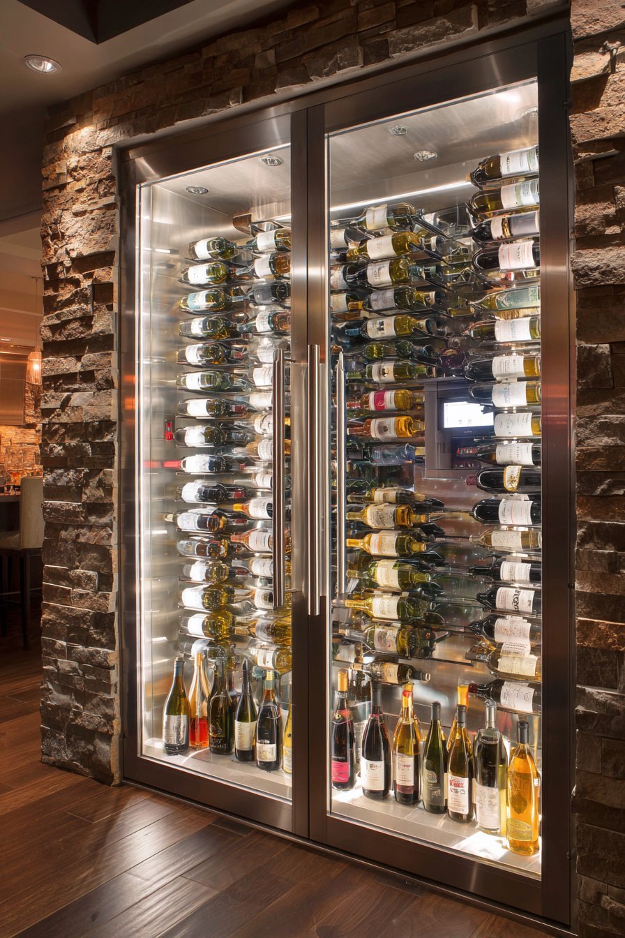 A full-length glass door showcases wine collections while maintaining proper storage conditions. Insulated dual-pane construction prevents temperature fluctuation affecting valuable vintages. Brushed stainless steel frame provides modern sophistication matching wine room’s purpose. The transparent door transforms storage into display.