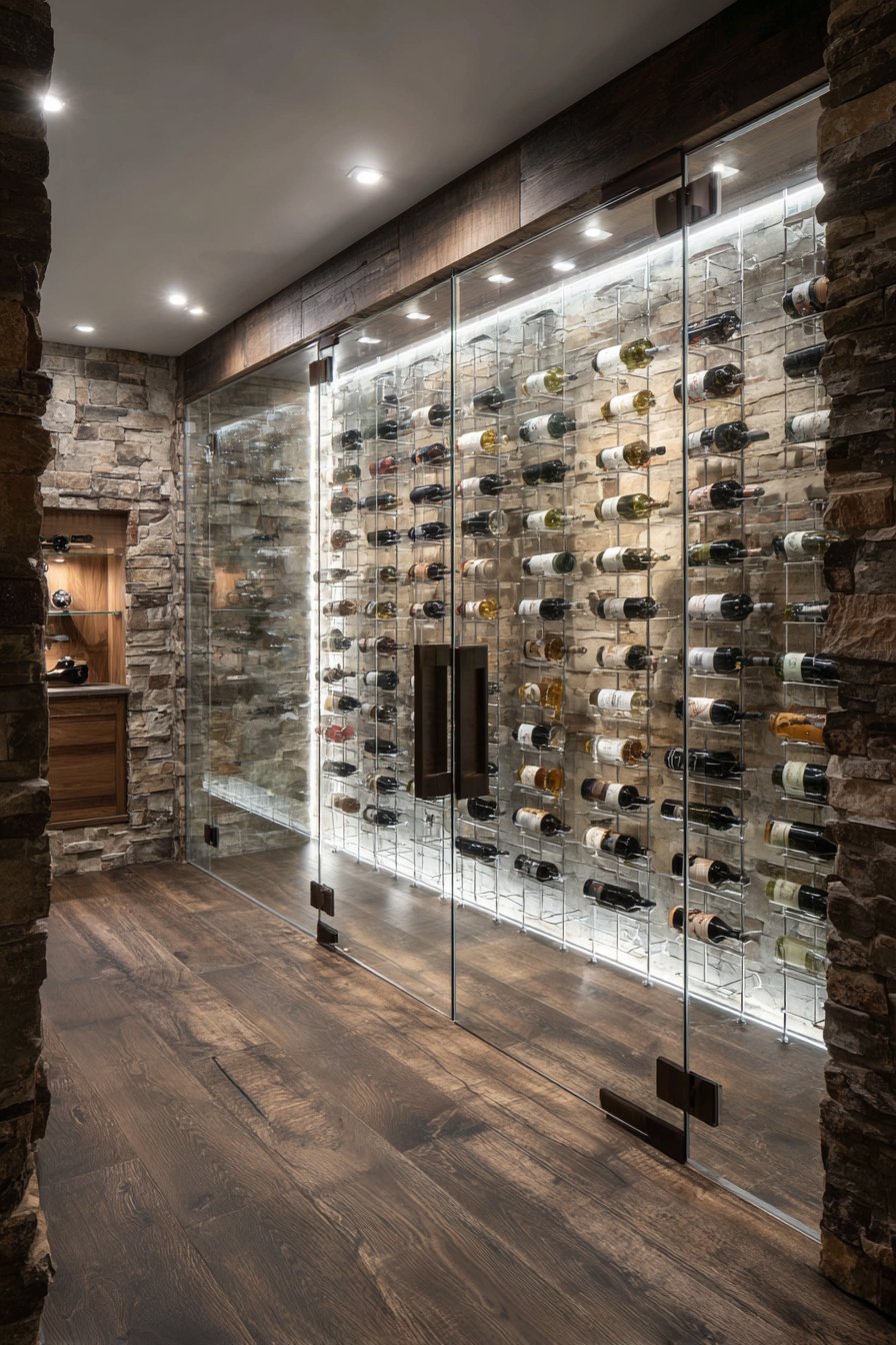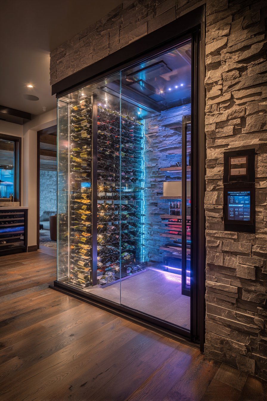 Floor-to-ceiling wine rack storage fills the visible interior with organized bottle collections. Ambient LED lighting illuminates labels and creates warm glow through glass. Temperature control panel mounts discreetly beside the door frame. Dark stained wood flooring and stone accent wall create ideal storage environment.