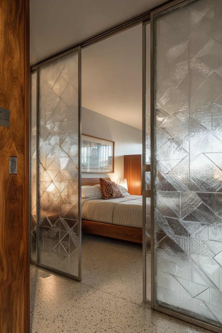 Original 1960s glass sliding closet doors showcase authentic period design. Aluminum frames hold frosted glass panels featuring geometric etched patterns. The vintage doors span an entire wall, providing access to built-in storage. Low-profile platform bed with walnut frame faces the doors across terrazzo flooring.