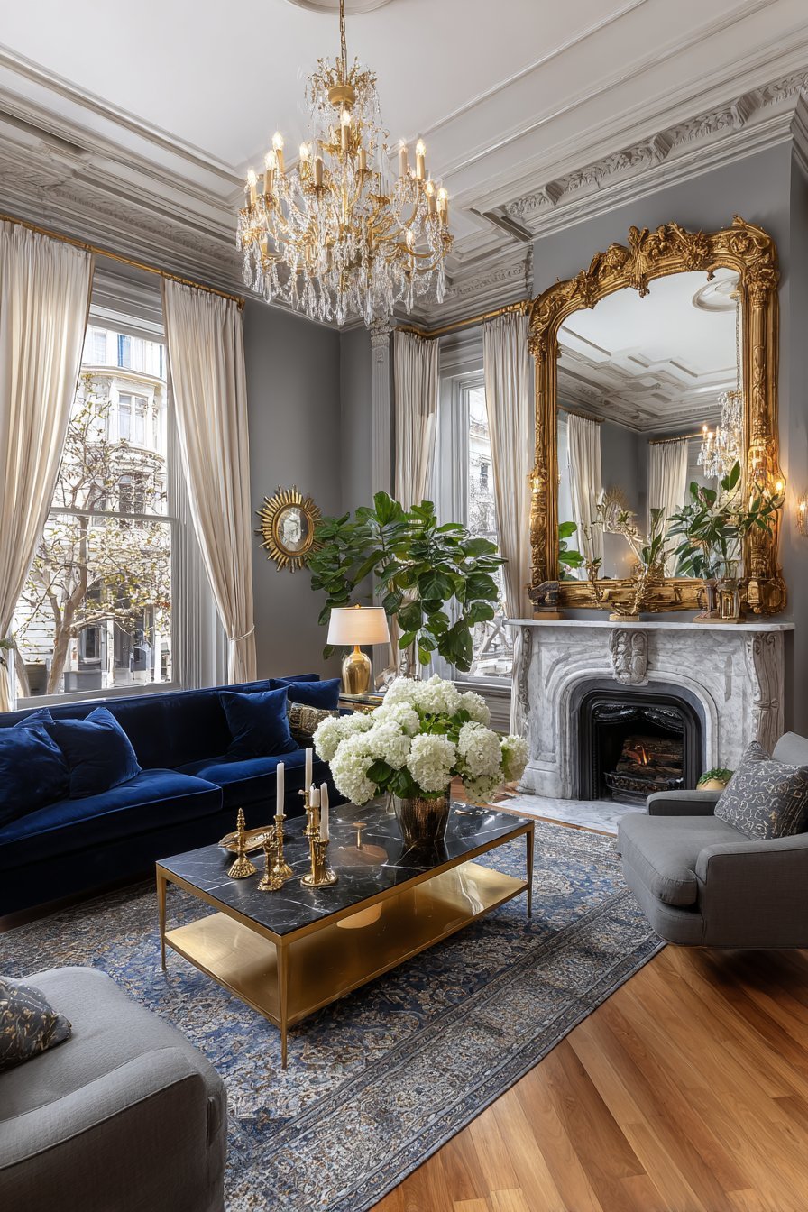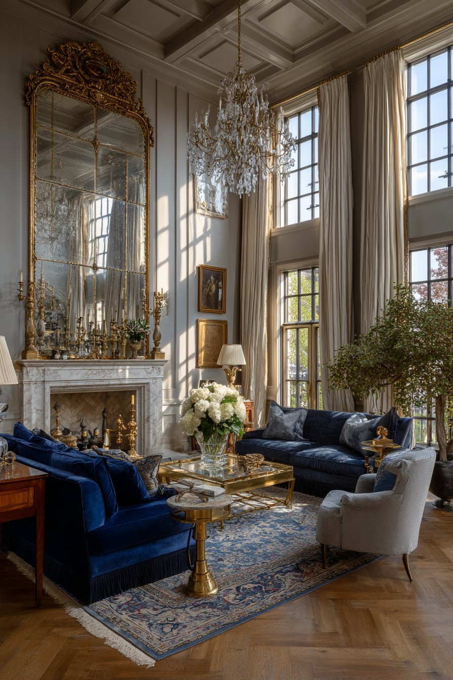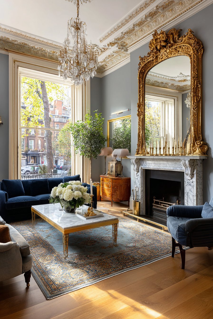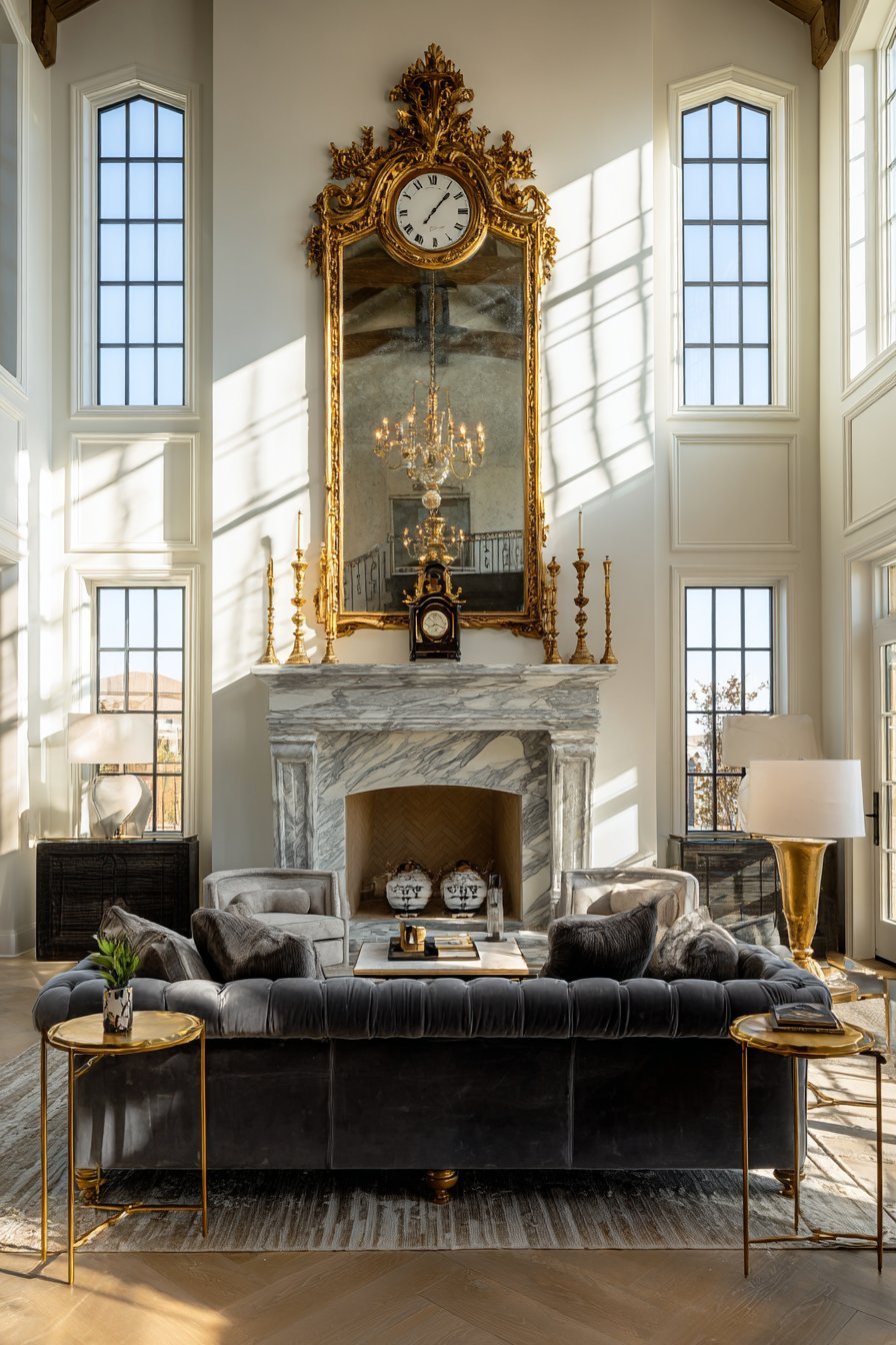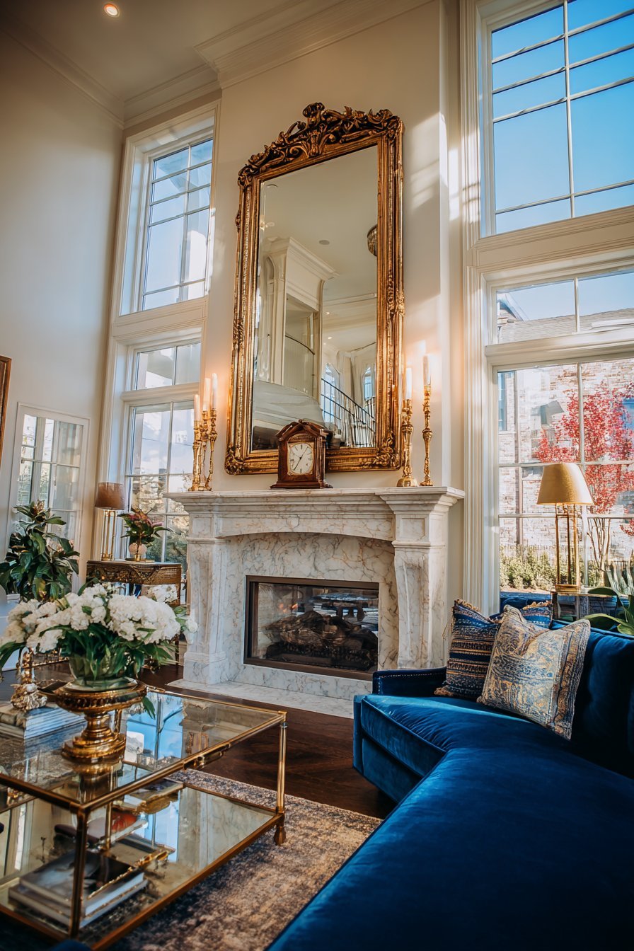An oversized ornate mirror with a gilded gold frame commands attention above a marble fireplace mantel. The antique-style frame features intricate detailing that speaks to classical craftsmanship. This mirror serves as the room’s undeniable focal point. Natural light from tall windows bounces off its reflective surface, flooding the space with brightness.