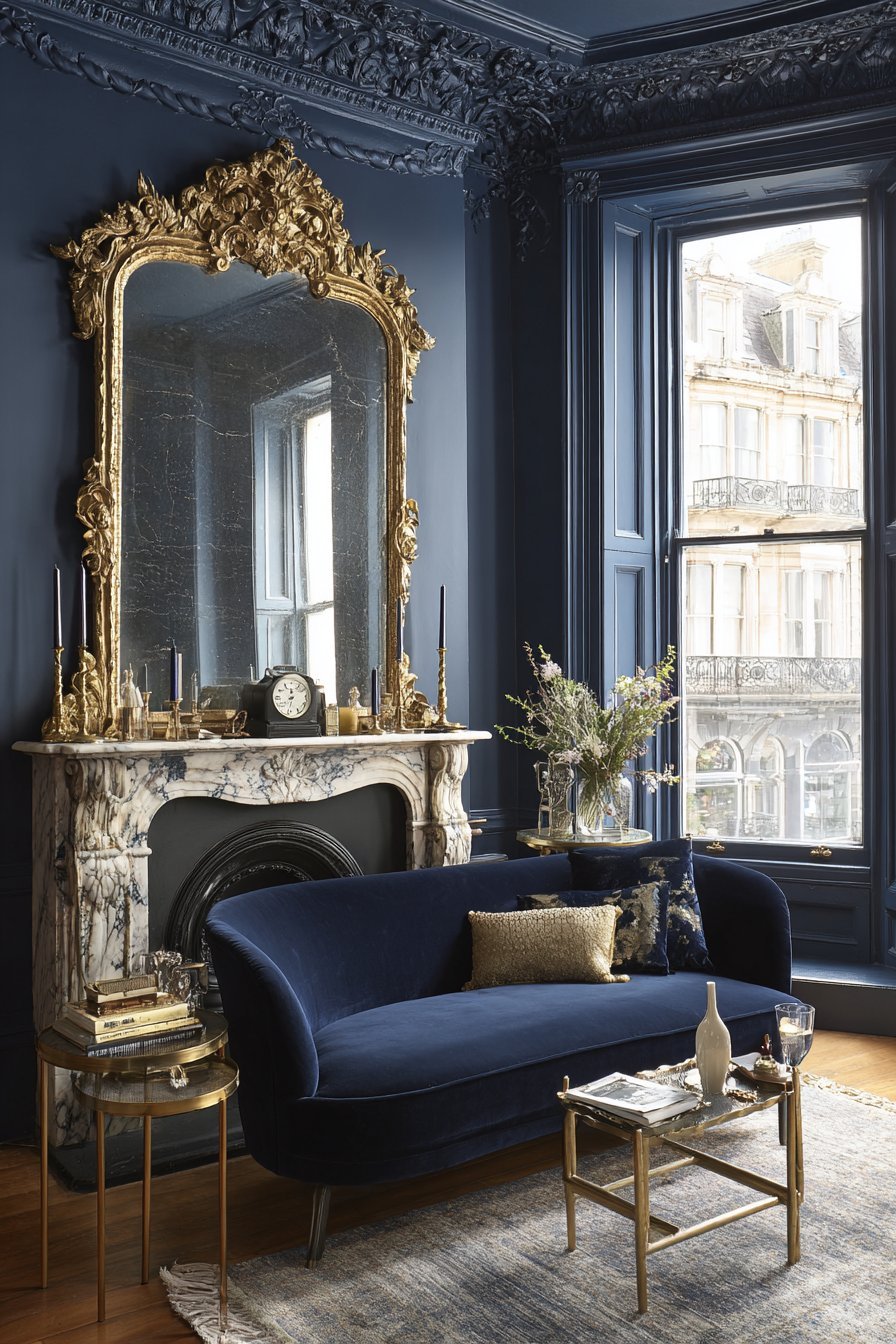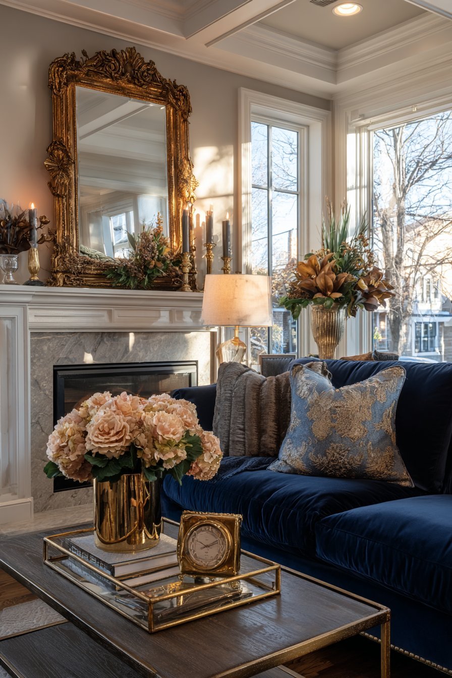 The velvet navy sofa faces the fireplace, creating a conversation area. Brass accent tables flank either side, echoing the mirror’s golden tones. On the mantel, gold candlesticks and a small brass clock complement the frame perfectly. The arrangement creates visual harmony through consistent metallic finishes.