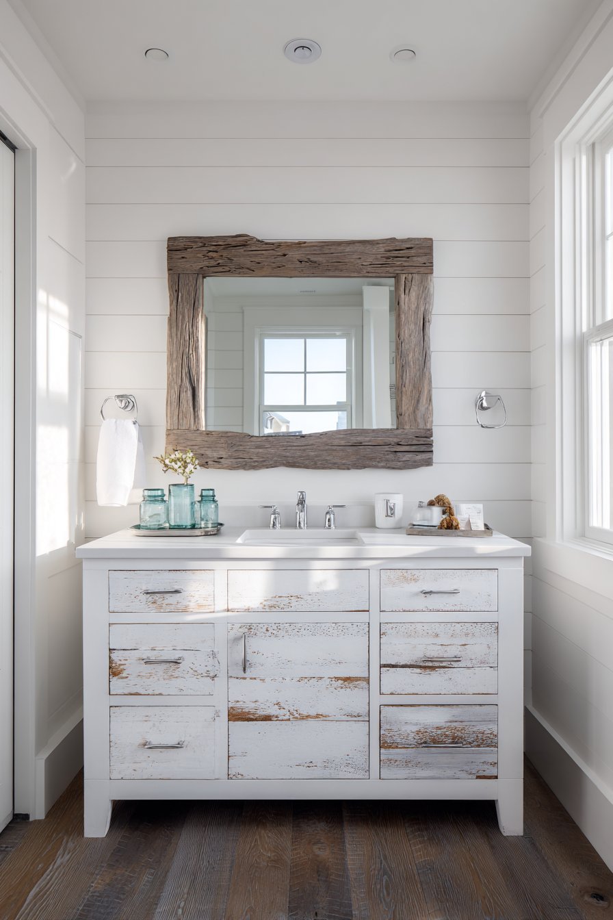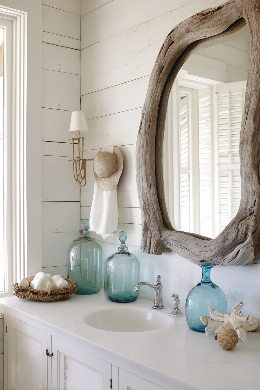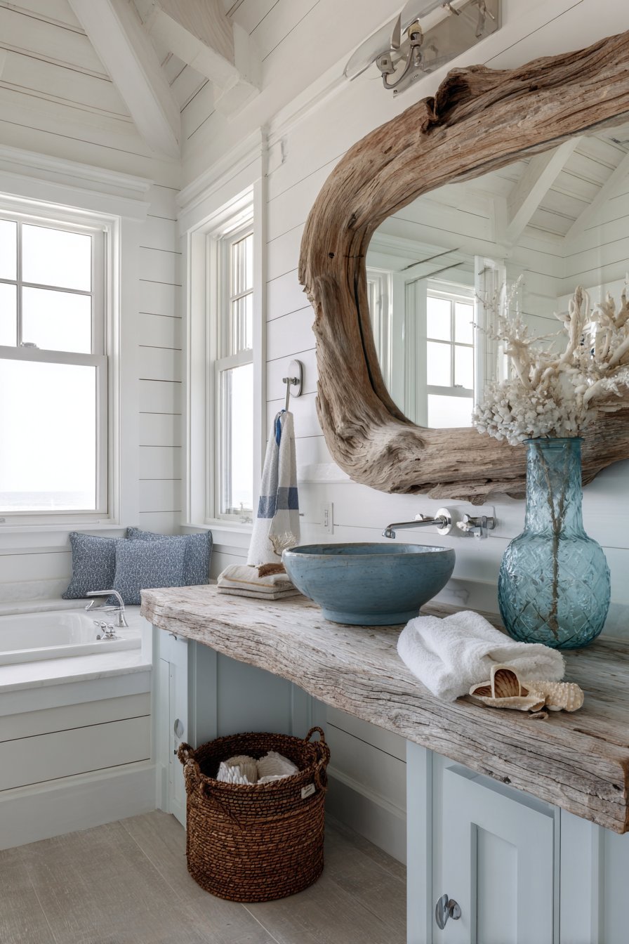 A driftwood-framed mirror with natural organic edges captures coastal essence. The weathered grey tones appear authentically aged by sea air. Above a white shiplap vanity, the mirror grounds the beach-inspired design. Rope accents and blue-green glass accessories reinforce the coastal theme.
