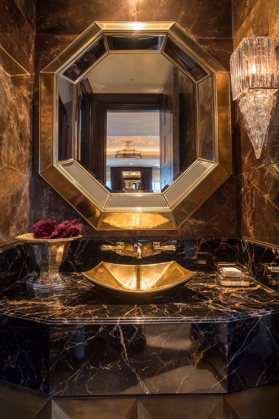 - Pair geometric mirrors with luxurious materials like marble and brass