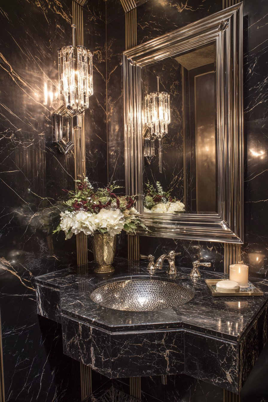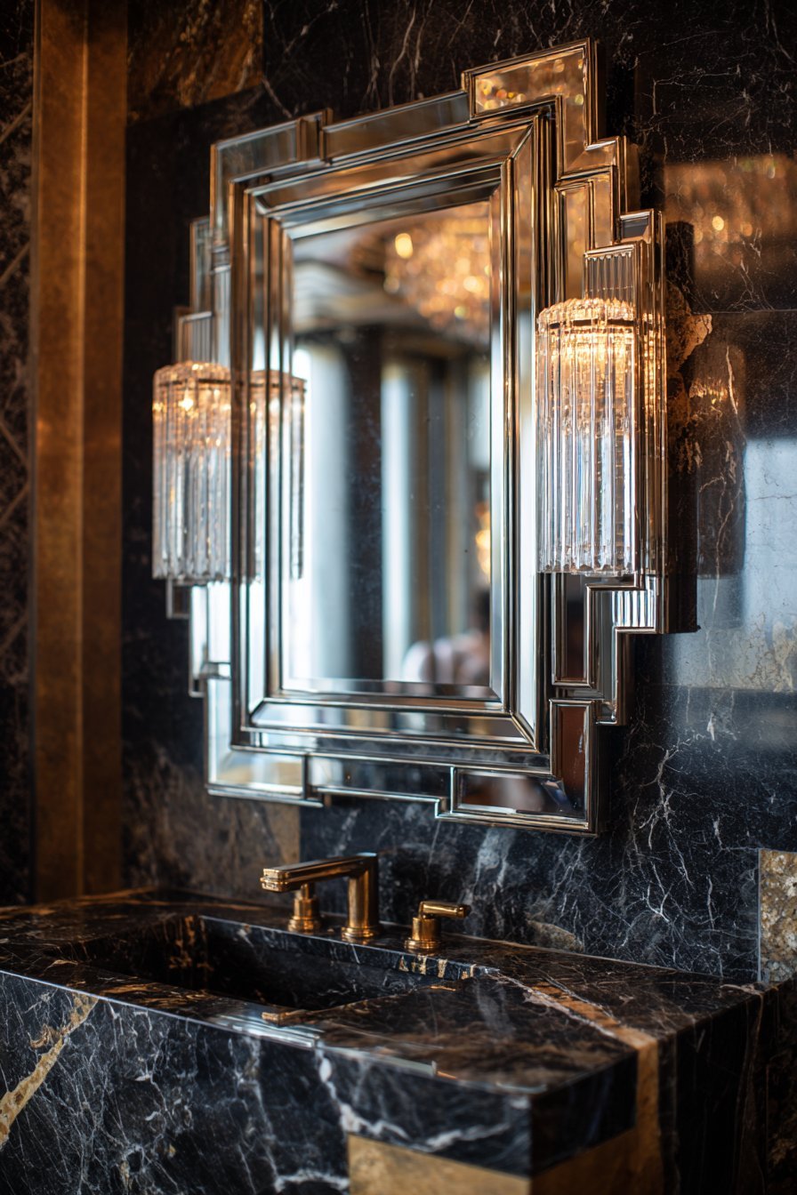 A geometric beveled mirror with stepped edges embodies art deco glamour. The polished chrome frame adds period-appropriate shine. Mounted above black marble vanity, it creates dramatic sophistication. The mirror’s faceted surface catches and multiplies light from crystal wall sconces.