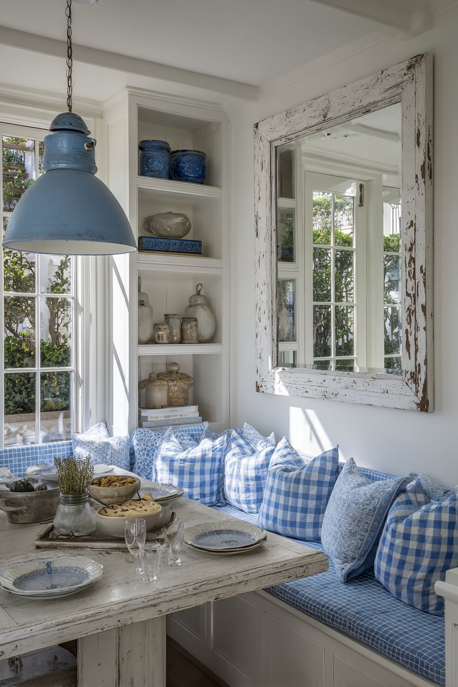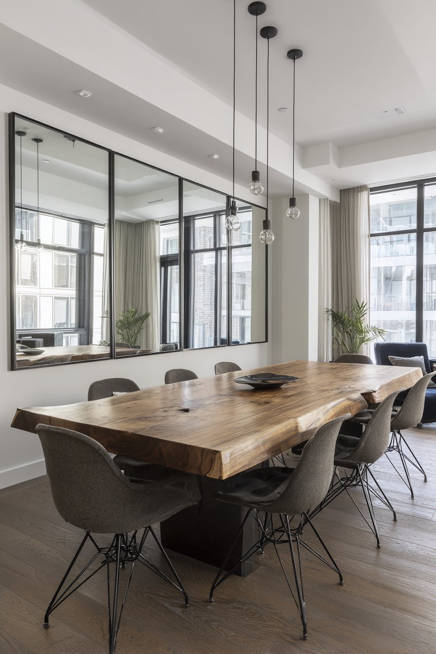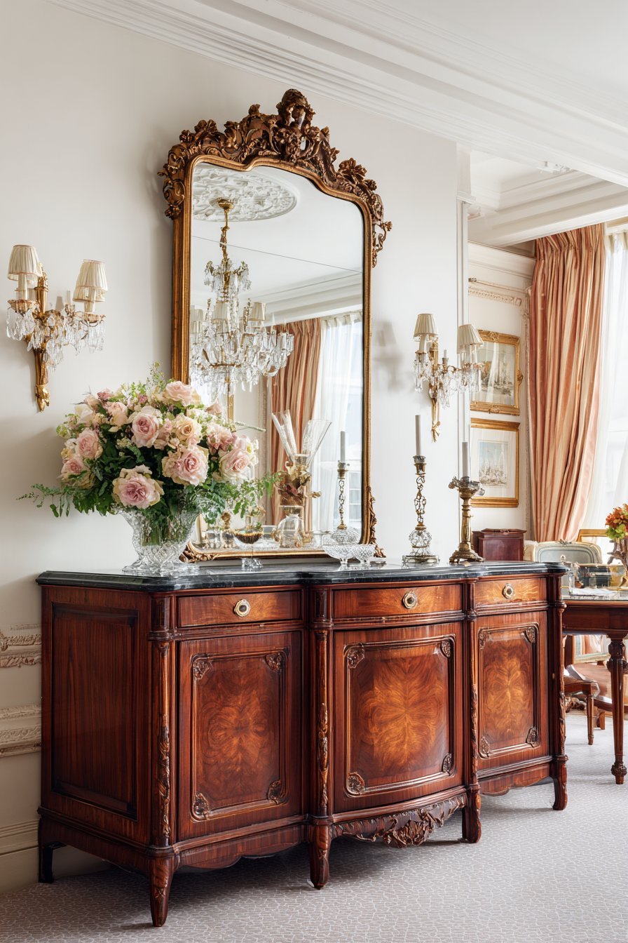 This classic mirror decorating technique demonstrates timeless design principles. The reflection multiplication enhances the room’s formal atmosphere. The carved frame details complement traditional dining furniture. Rich mahogany tones add warmth and sophistication.