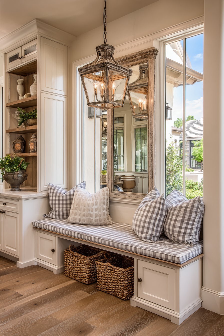 Modern farmhouse design refreshes traditional elements. The window-inspired mirror adds architectural character. Segmented reflections create dynamic visual effects. Fresh, updated rustic style appeals across generations.