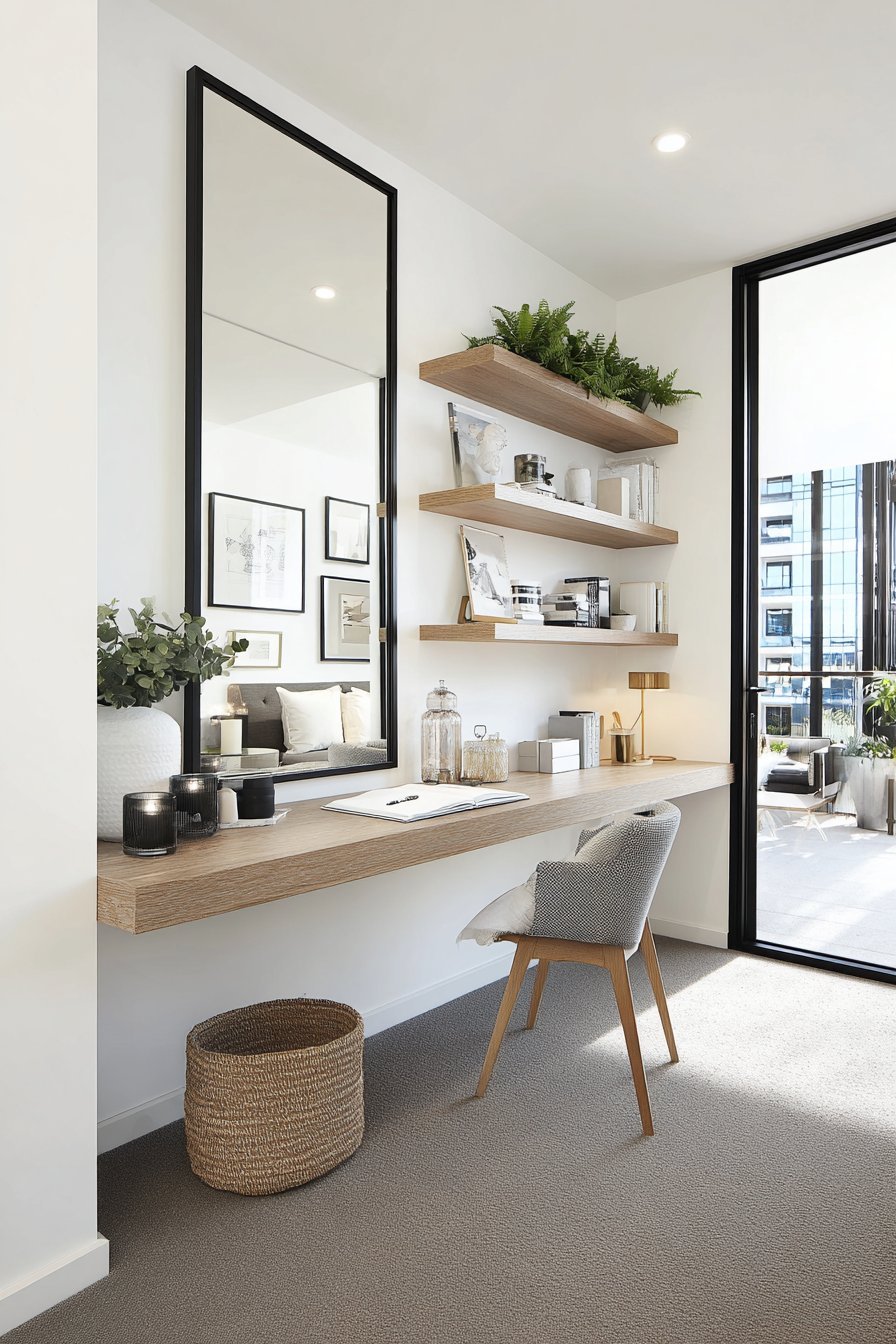 Soft morning light from nearby windows creates bright, even reflections. The mirror’s strategic placement doubles the perceived space. Natural wood grain maintains Scandinavian warmth. Clean design principles create open, breathable environments.