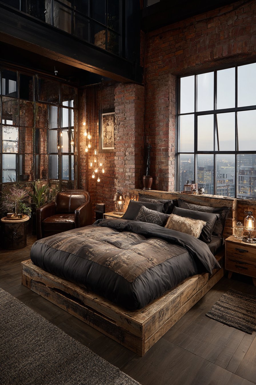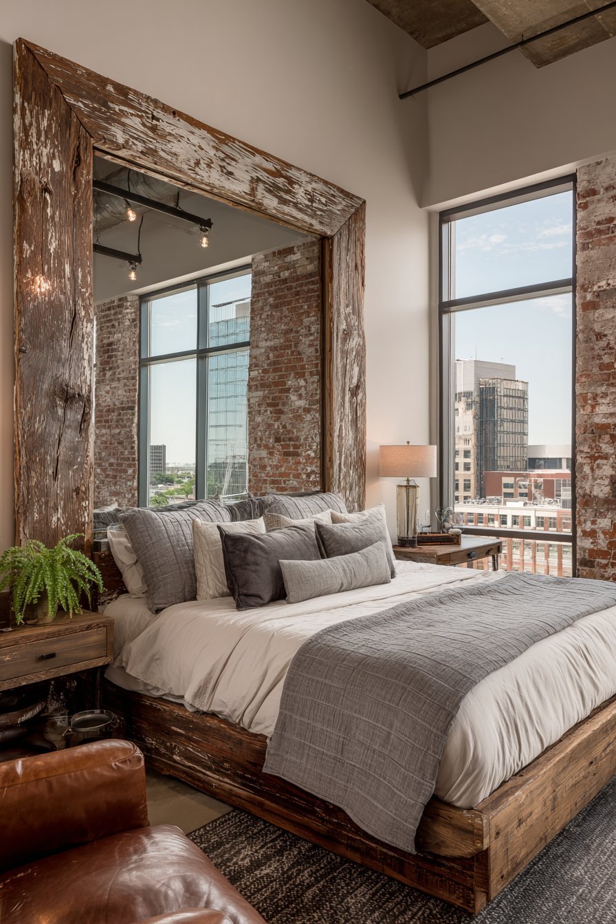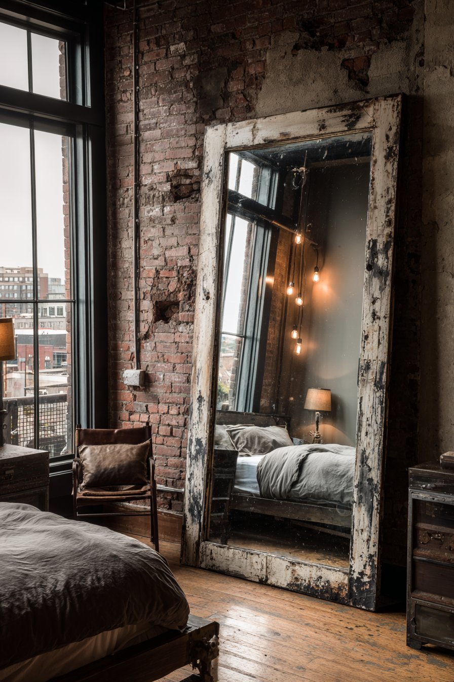 Reclaimed wood nightstands and distressed leather chair complete the industrial scene. The mirror’s authentic weathering adds irreplaceable character. Moody natural lighting from tall industrial windows creates atmospheric effects. The balance between rough and reflective surfaces defines the aesthetic.