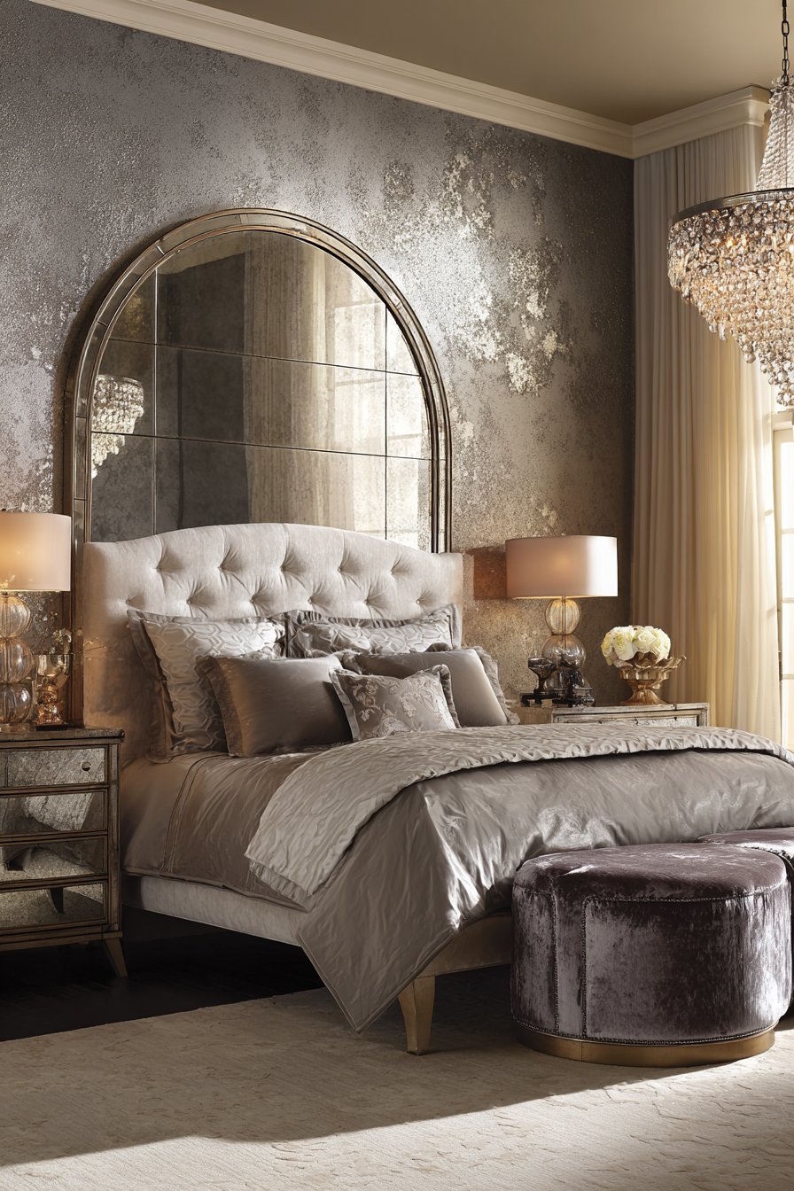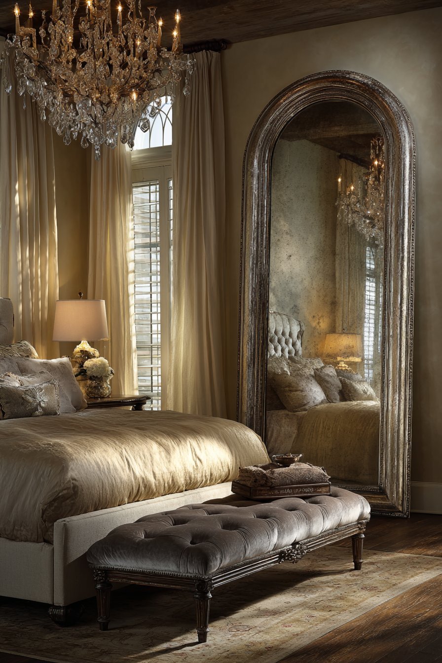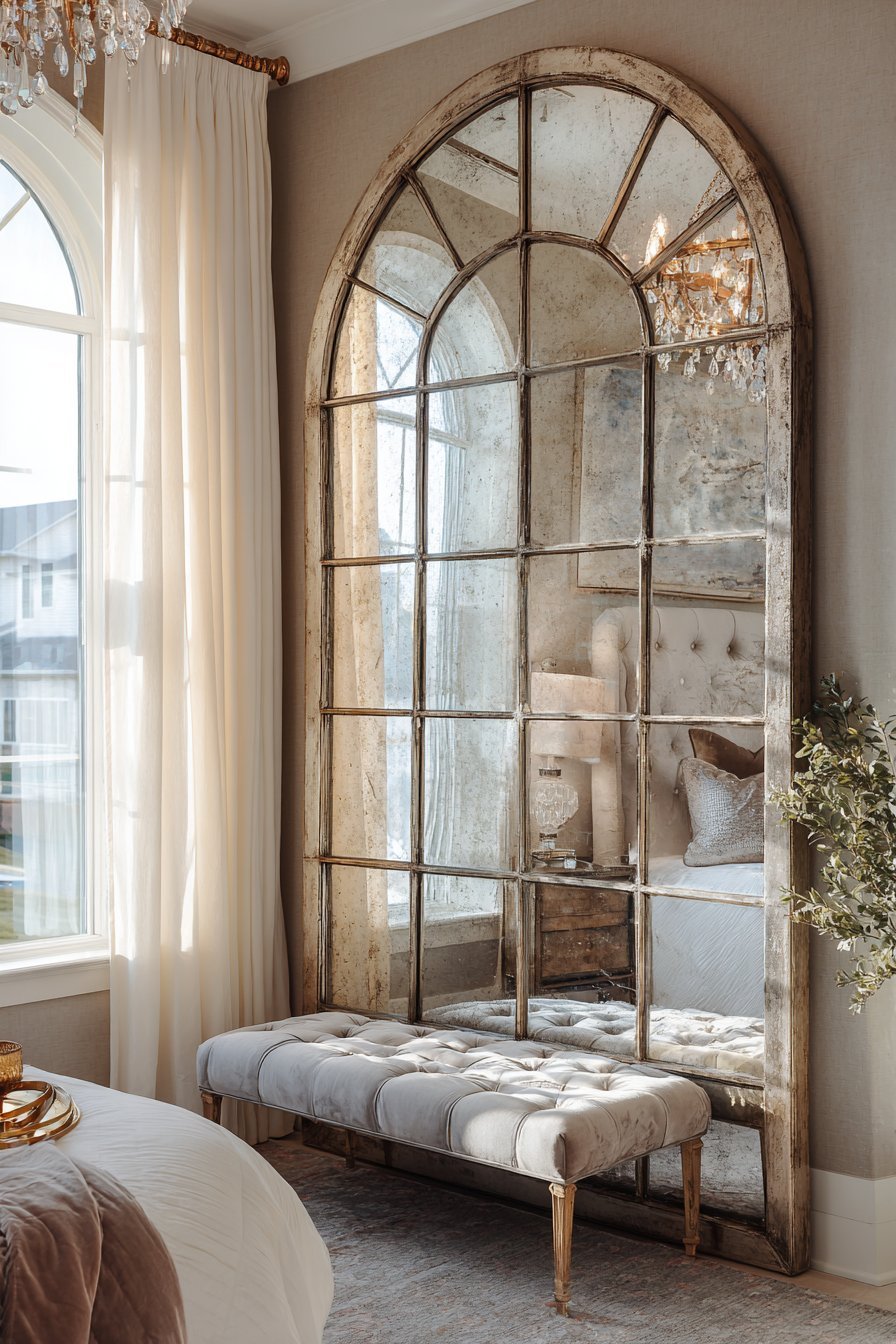 Reclaimed wood nightstands and distressed leather chair complete the industrial scene. The mirror’s authentic weathering adds irreplaceable character. Moody natural lighting from tall industrial windows creates atmospheric effects. The balance between rough and reflective surfaces defines the aesthetic.