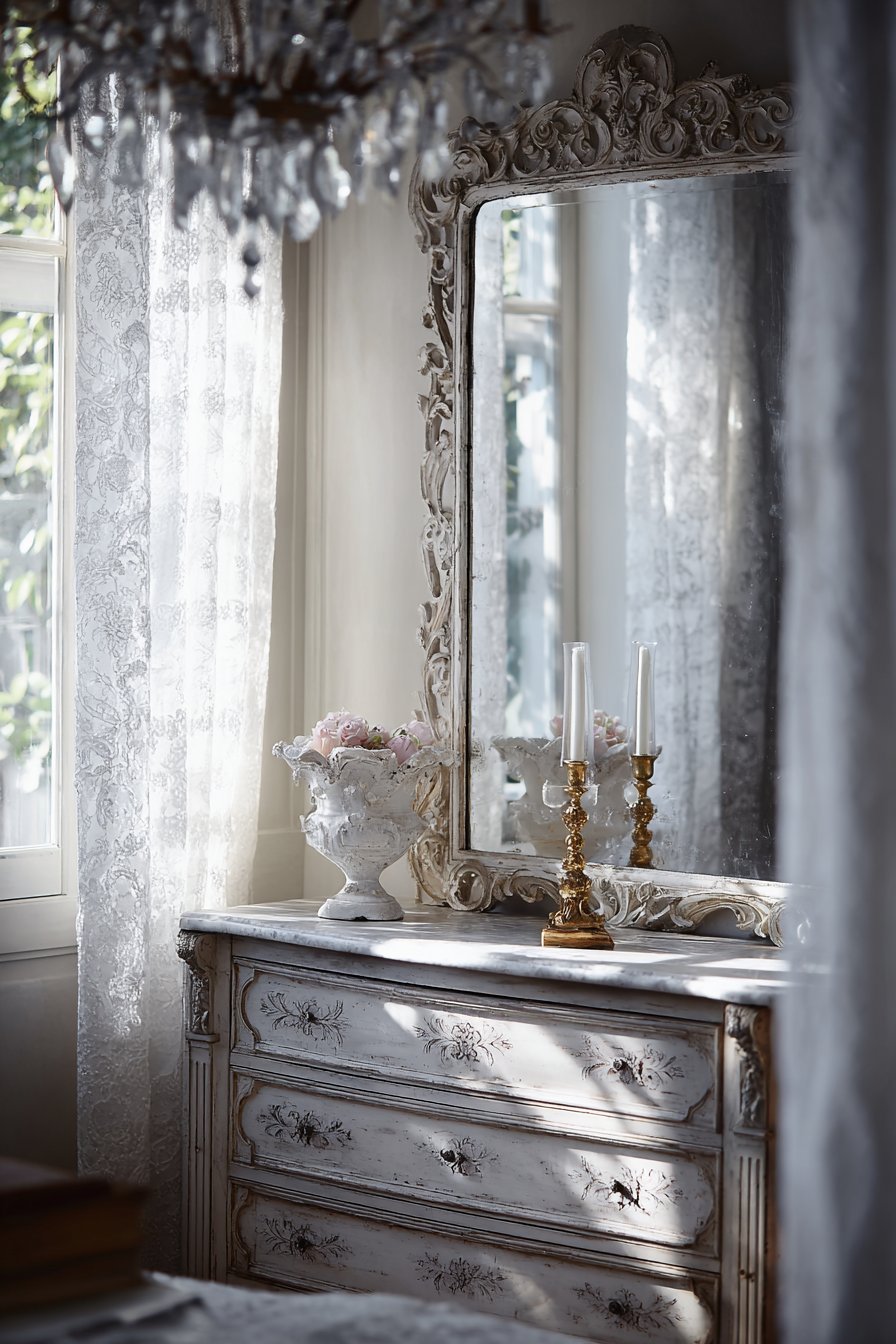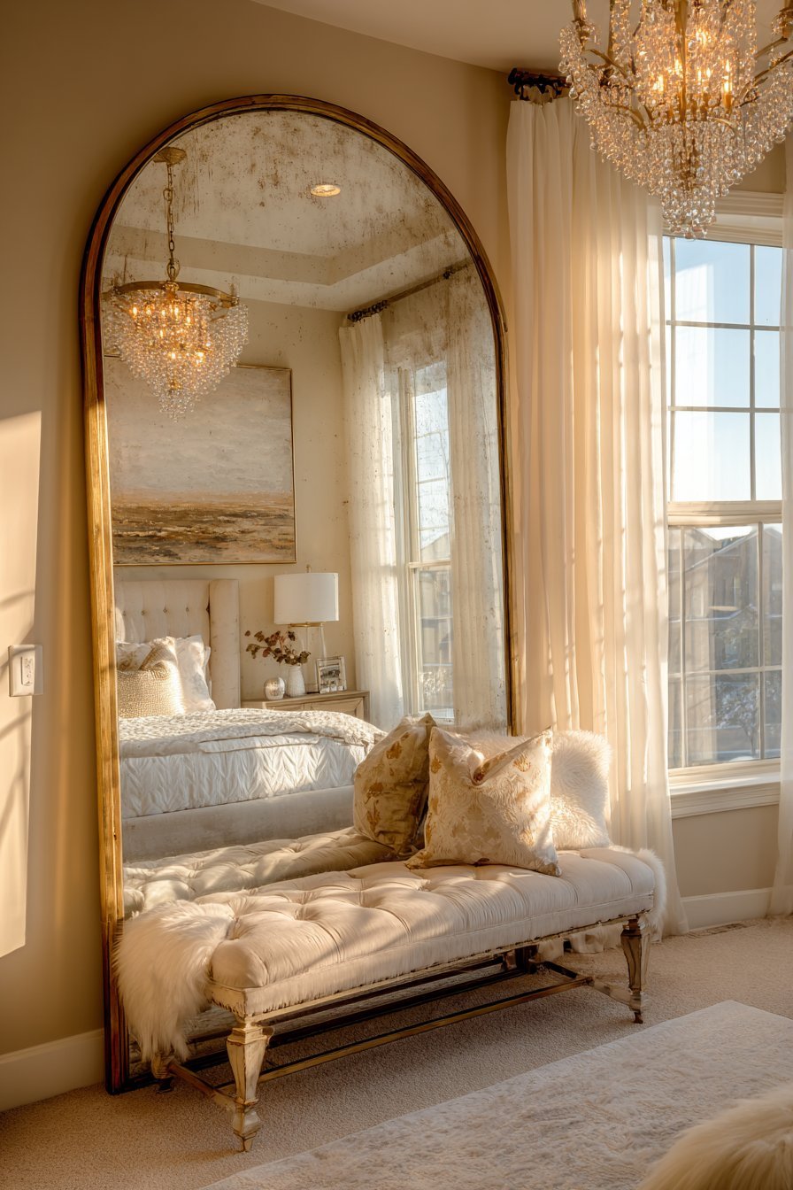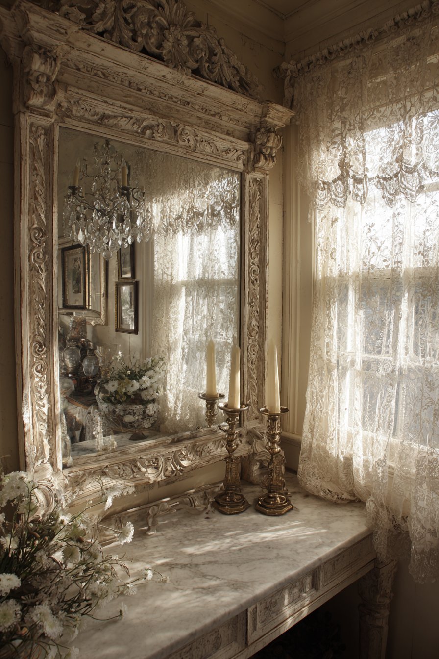 The mirror’s reflective quality doubles the room’s perceived depth. It captures the window light and redistributes it throughout the space. Afternoon sunlight creates subtle shadows that highlight the frame’s carved details. The interplay between reflection and ornamentation adds sophisticated dimension.