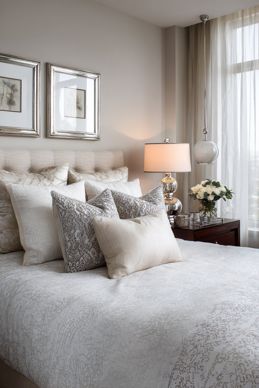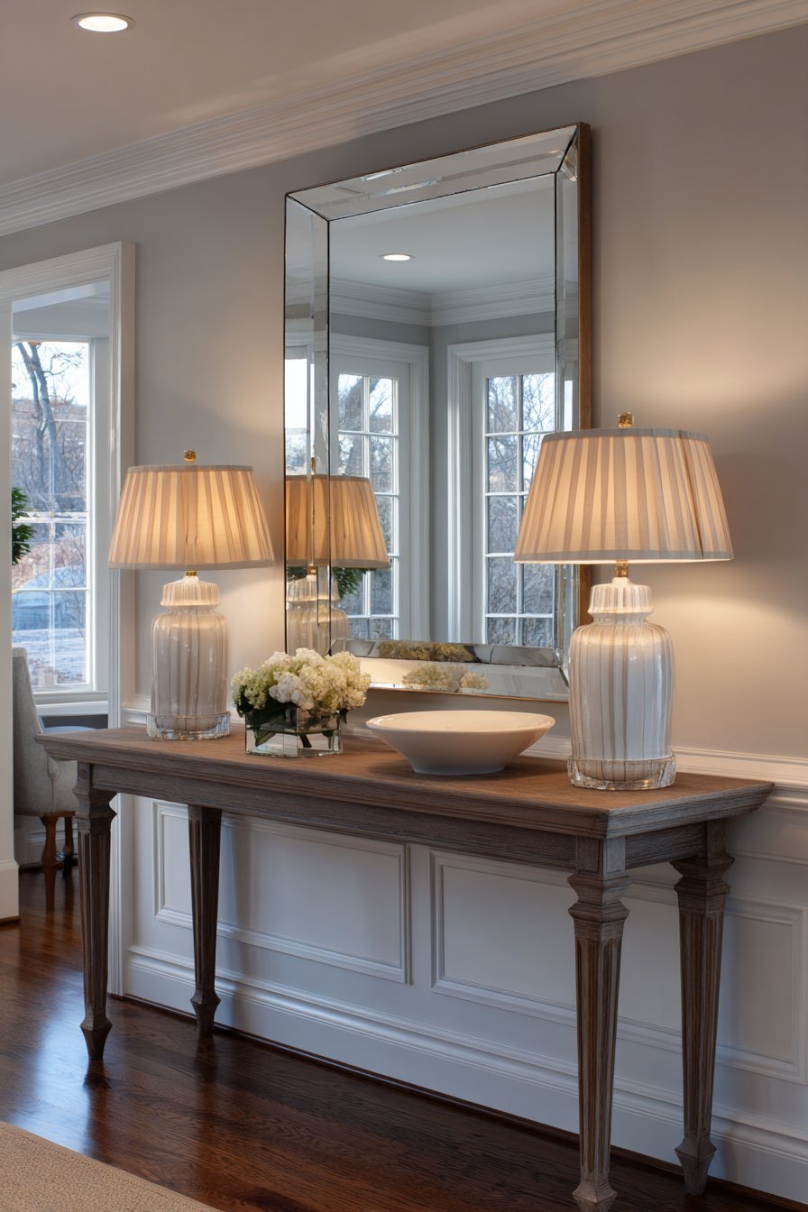 Soft diffused natural light from sheer curtains combines with warm lamplight. Multiple gentle reflections create layered lighting depth. The symmetrical approach feels calming and organized. Transitional elements bridge traditional and contemporary successfully.