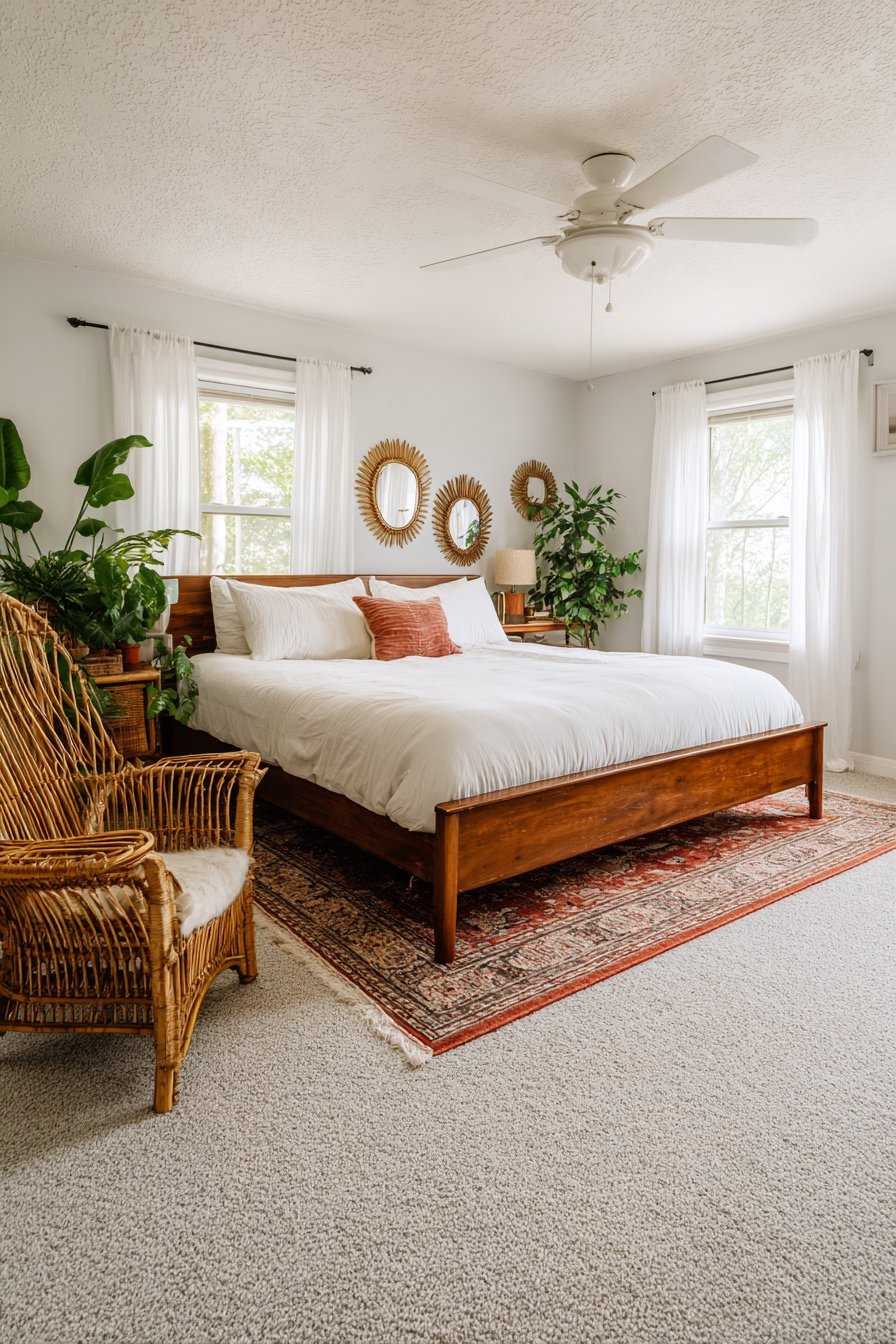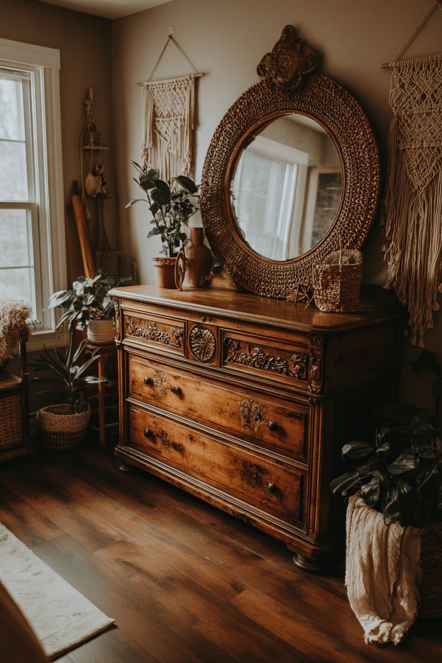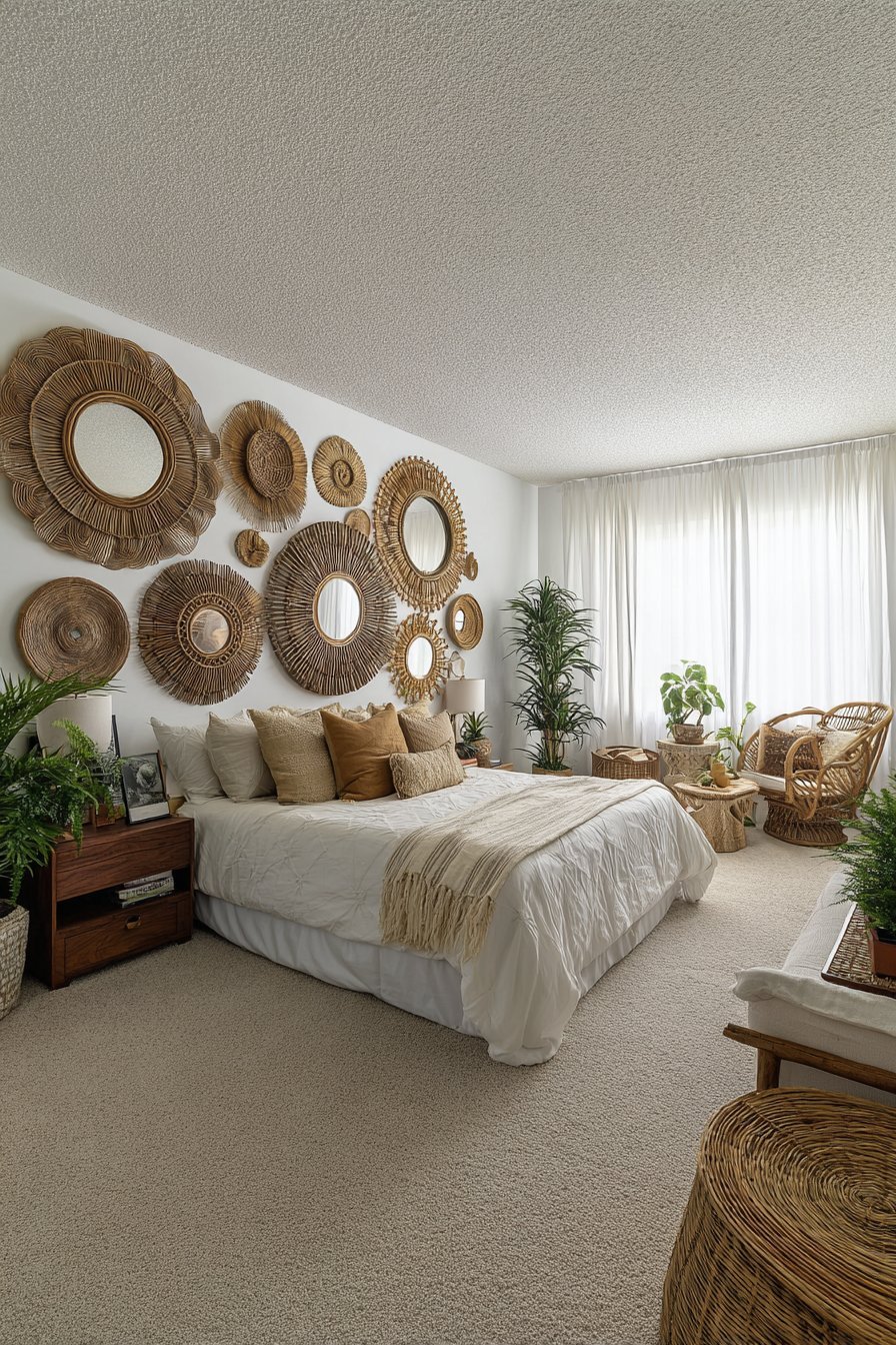 A curated collection of vintage mirrors in various shapes and sizes creates an organic gallery wall. Brass sunburst designs mix with carved wooden frames and macramé-wrapped pieces. The eclectic arrangement forms a captivating focal point above the bed. Each mirror tells its own story through distinctive styling.