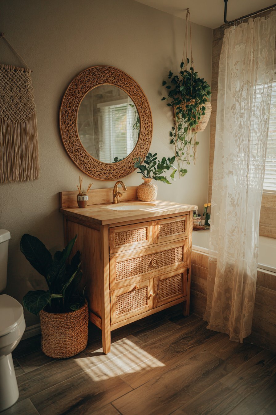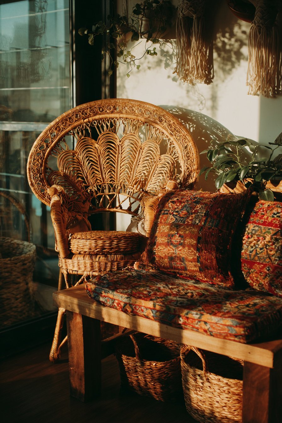 Bohemian style celebrates global artisan craftsmanship. The peacock mirror represents handwoven traditional techniques. Natural materials create warm, inviting atmospheres. Personal expression trumps design rules.