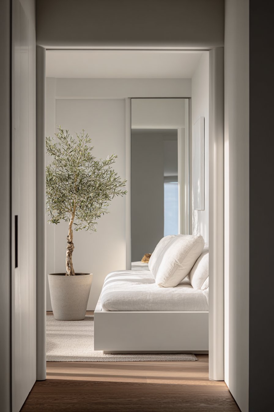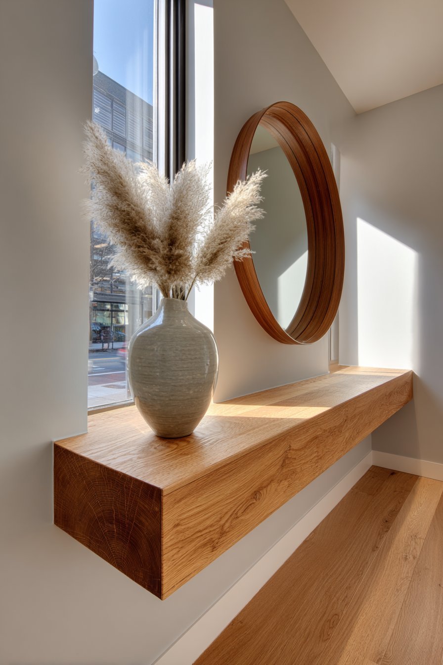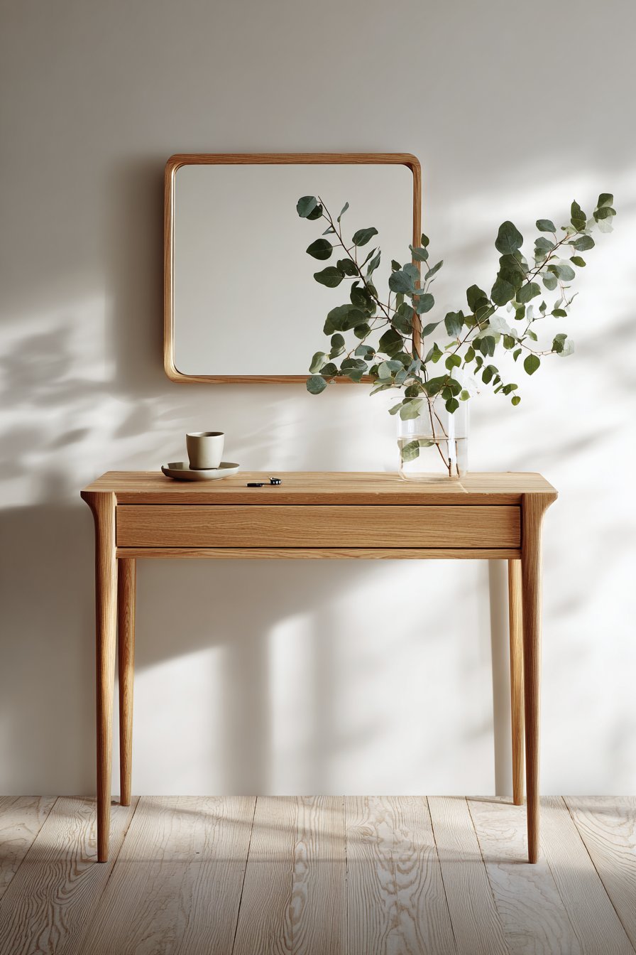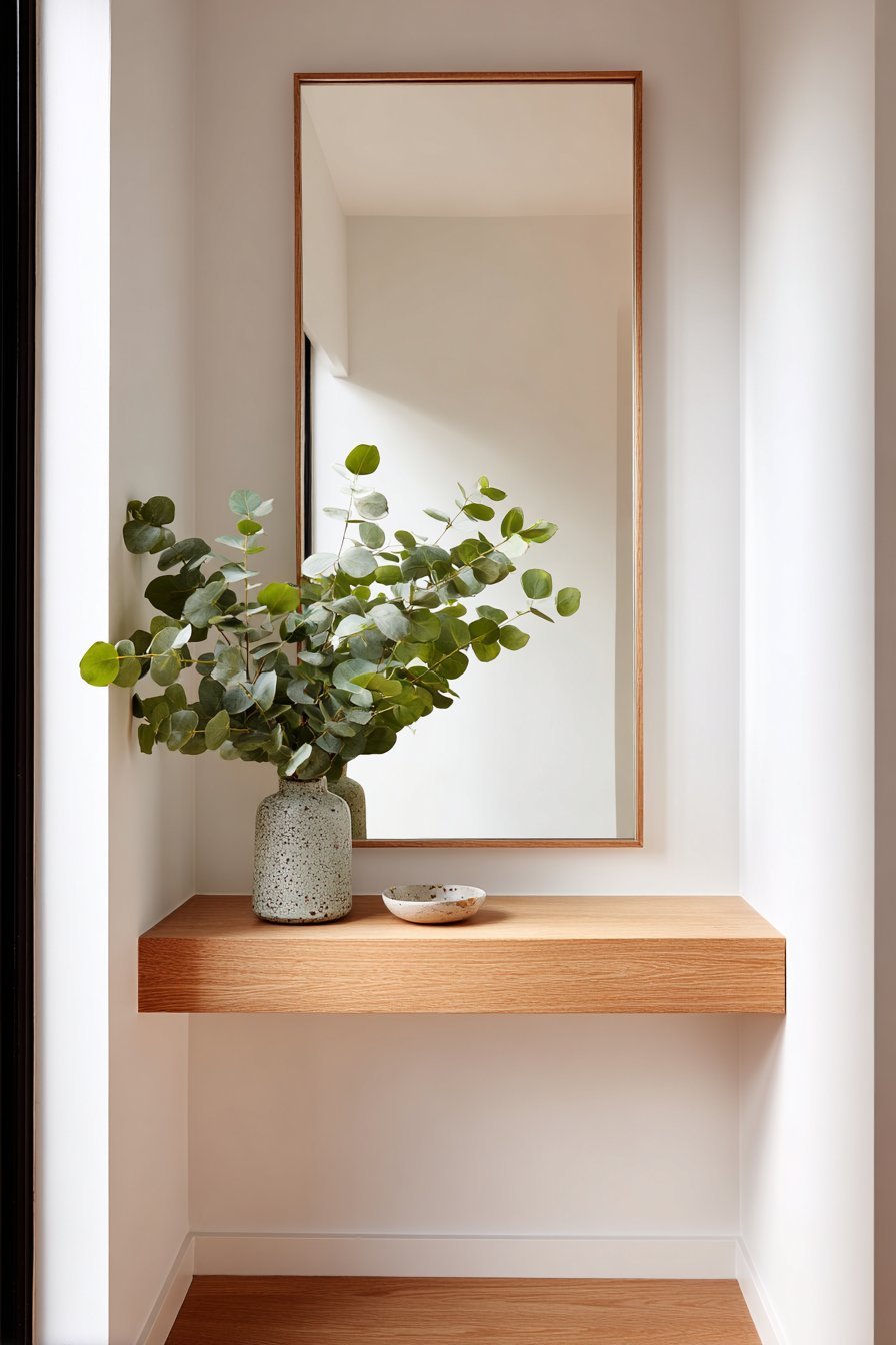 A small ceramic dish for keys and a single stem vase with eucalyptus provide understated styling. The pared-down approach eliminates visual clutter. Morning light creates gentle reflections that enhance the space’s openness. The oak frame brings warmth to the neutral palette.