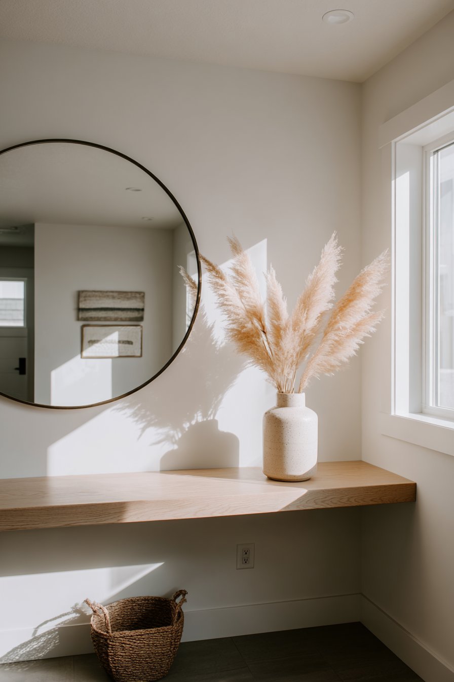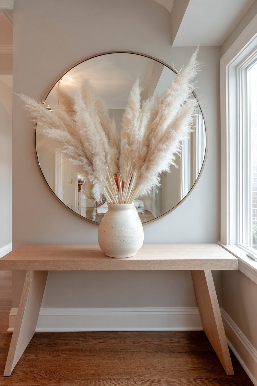 The console table displays minimal styling with intention. A simple ceramic vase holds dried pampas grass, adding organic texture. The arrangement demonstrates restraint and purpose. Morning light from a nearby window creates soft highlights on the mirror’s polished edge.
