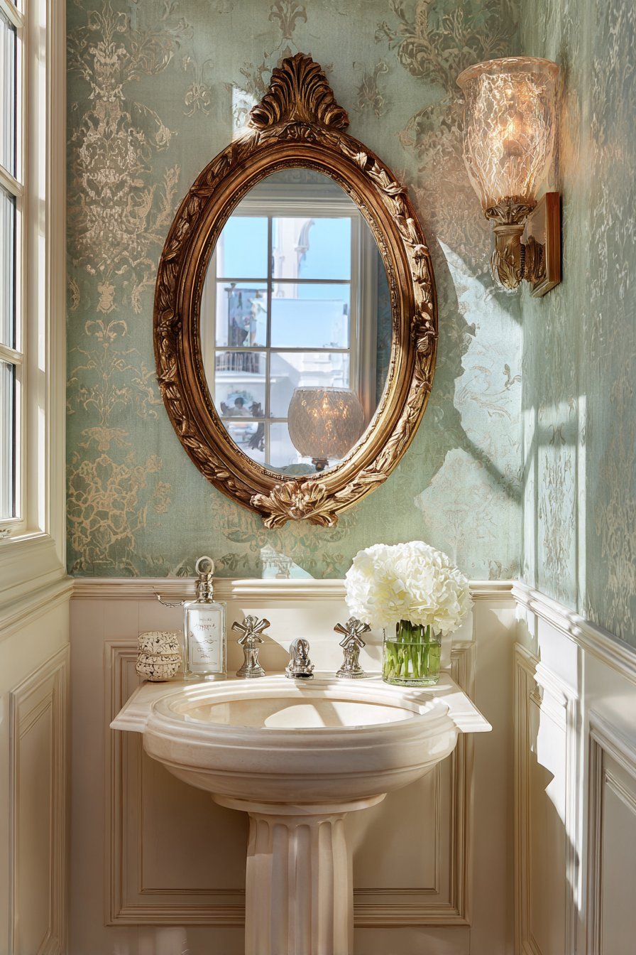 Victorian design celebrates ornamentation and craftsmanship. The gilded frame represents the era’s love of decorative arts. Oval shapes soften rectangular room geometries. Historical authenticity creates sophisticated vintage appeal.