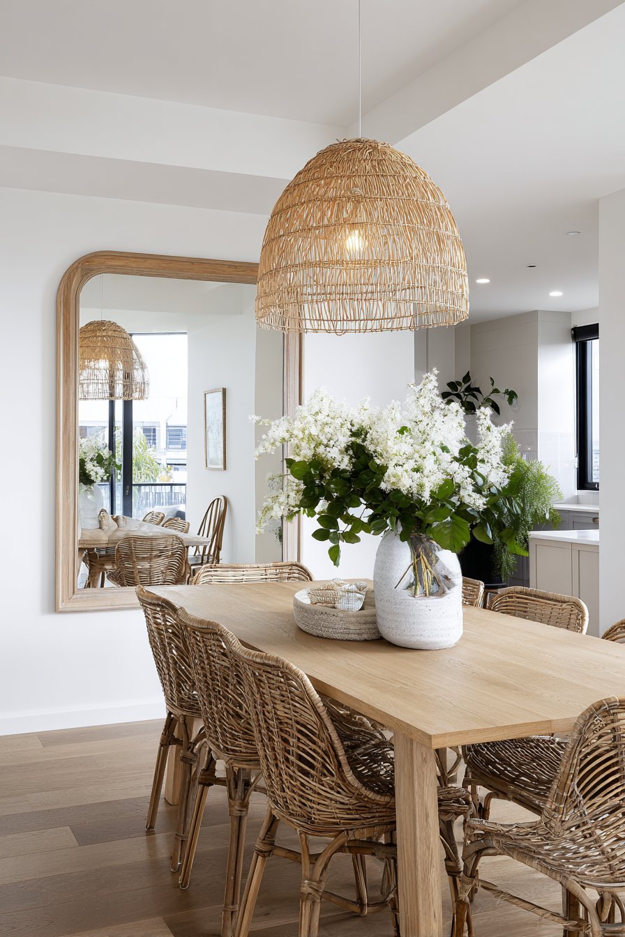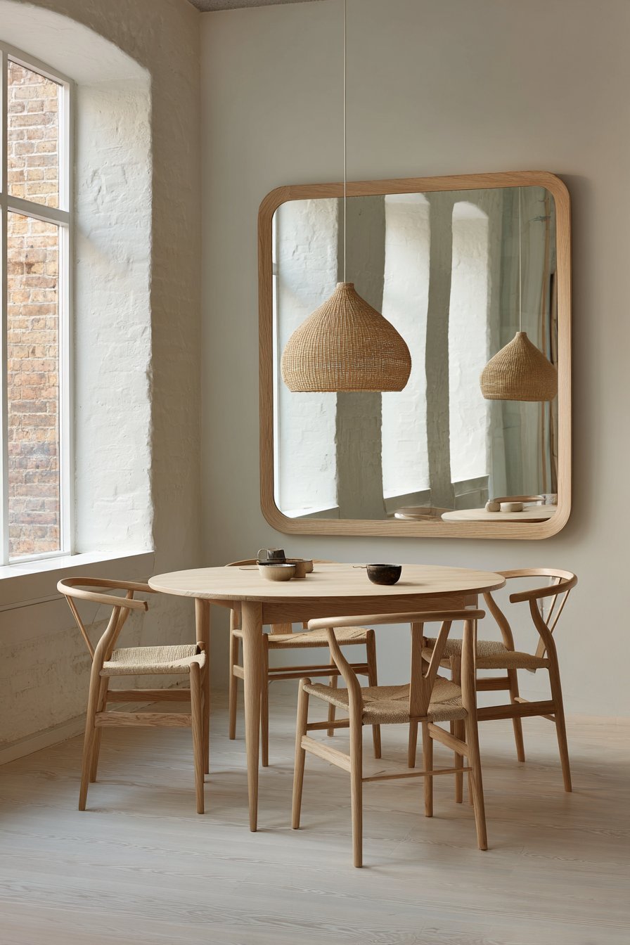 A large rectangular mirror in simple light ash wood frame visually expands compact dining area. The mirror reflects a round white oak table with Windsor chairs. A woven natural fiber pendant light appears in the reflection. Blonde wood flooring and whitewashed walls create airy Nordic aesthetic.
