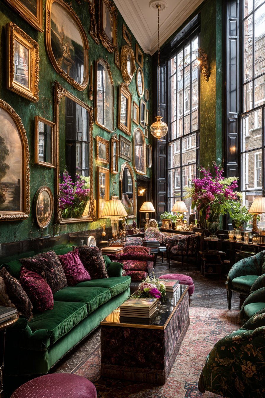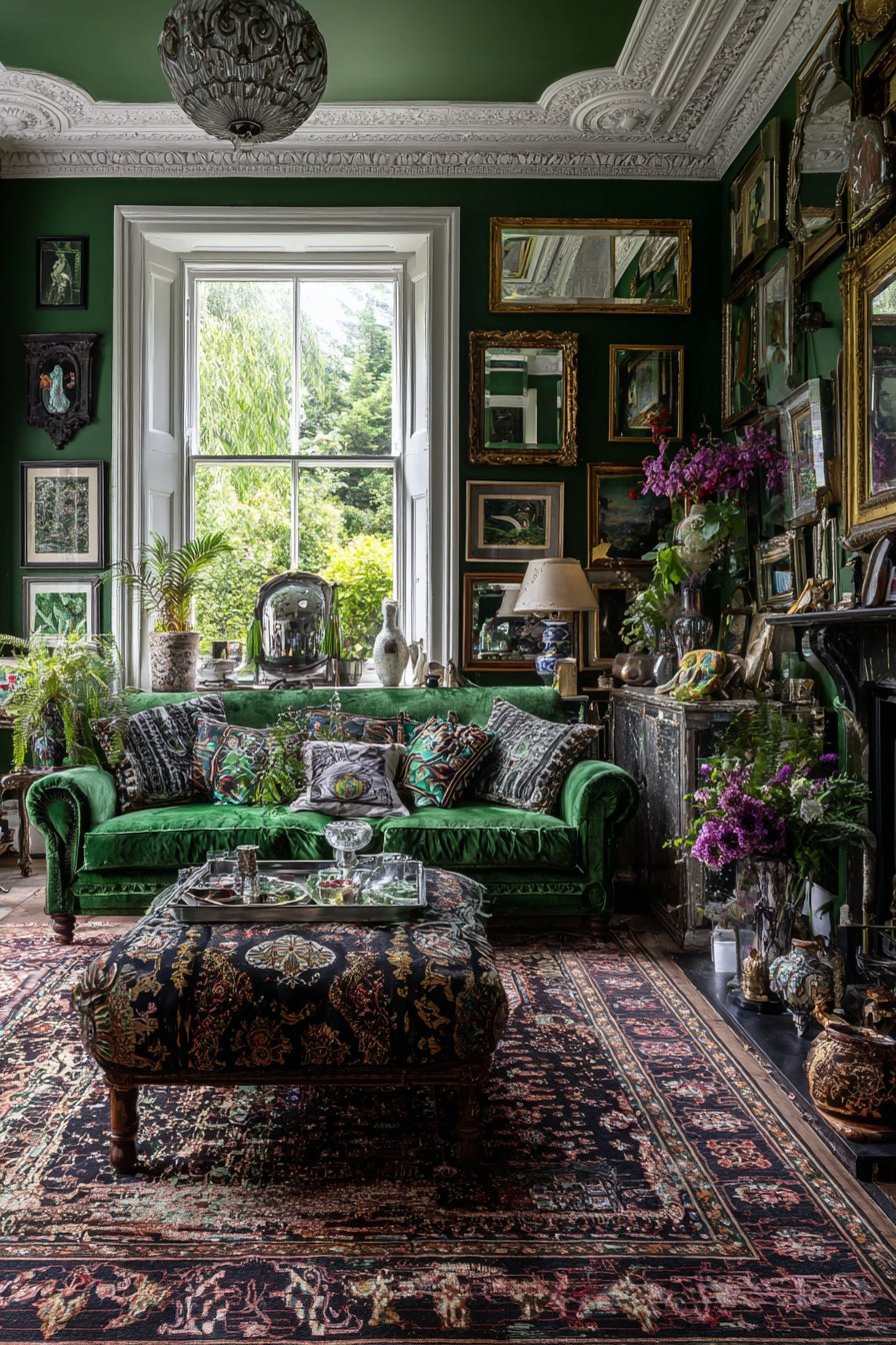 Natural daylight from tall windows combines with lamplight illuminating varied surfaces. The bold approach celebrates abundance and personal curation. Rich emerald wall color provides dramatic backdrop. Luxurious materials and patterns create sumptuous atmosphere.
