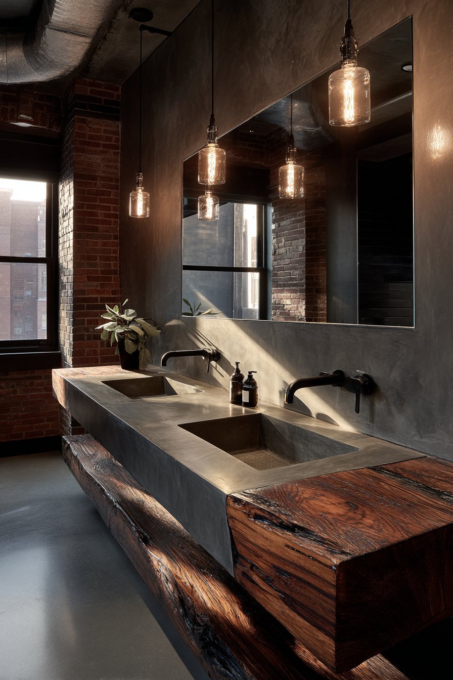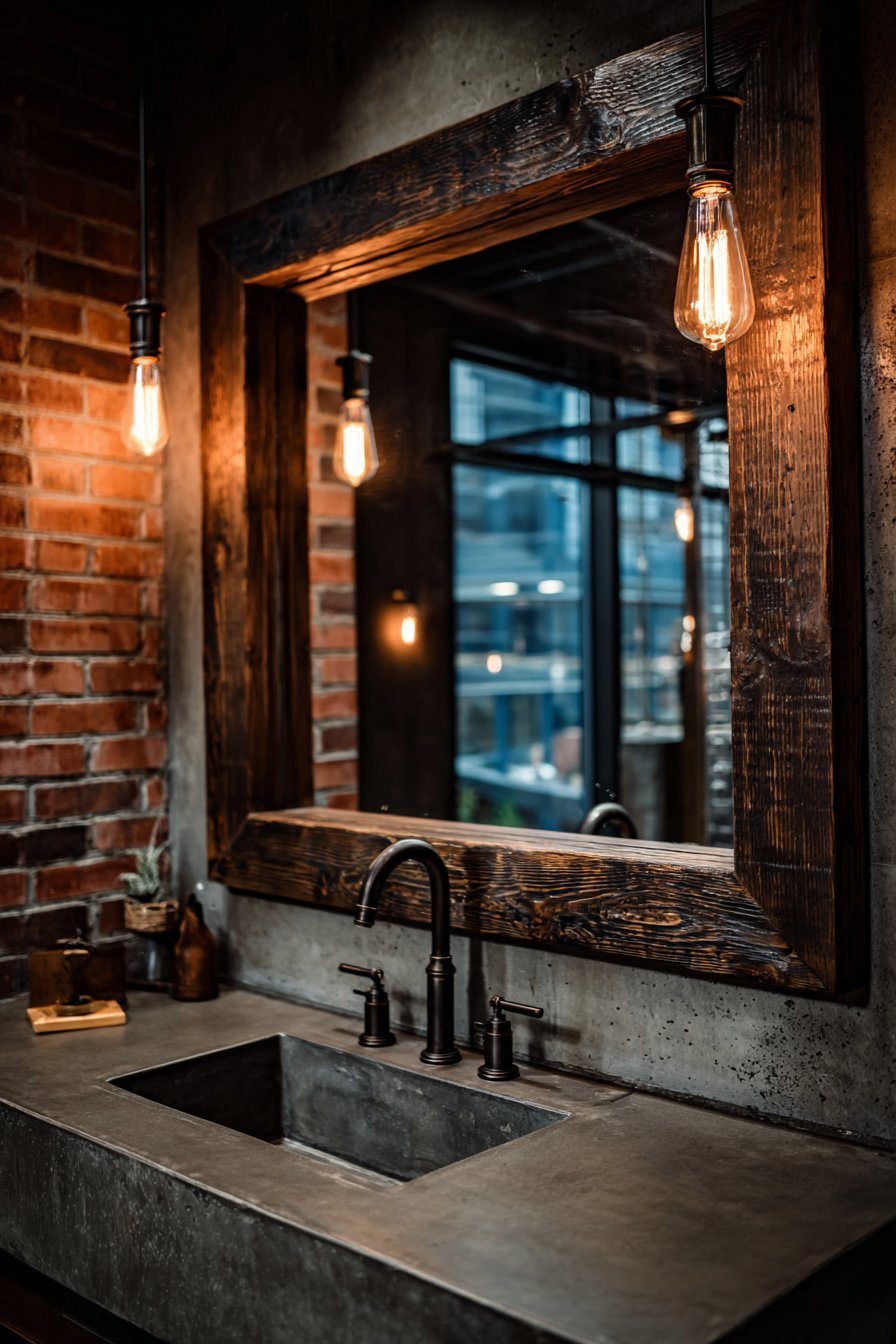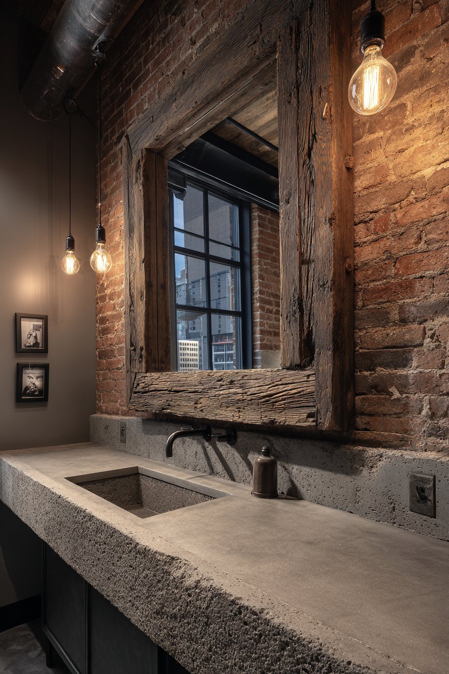 Exposed brick walls and metal shelving complete the industrial atmosphere. The mirror reflects Edison bulb pendant lighting. Moody natural lighting from small windows creates dramatic shadows. The contrast between rough and polished surfaces defines the style.