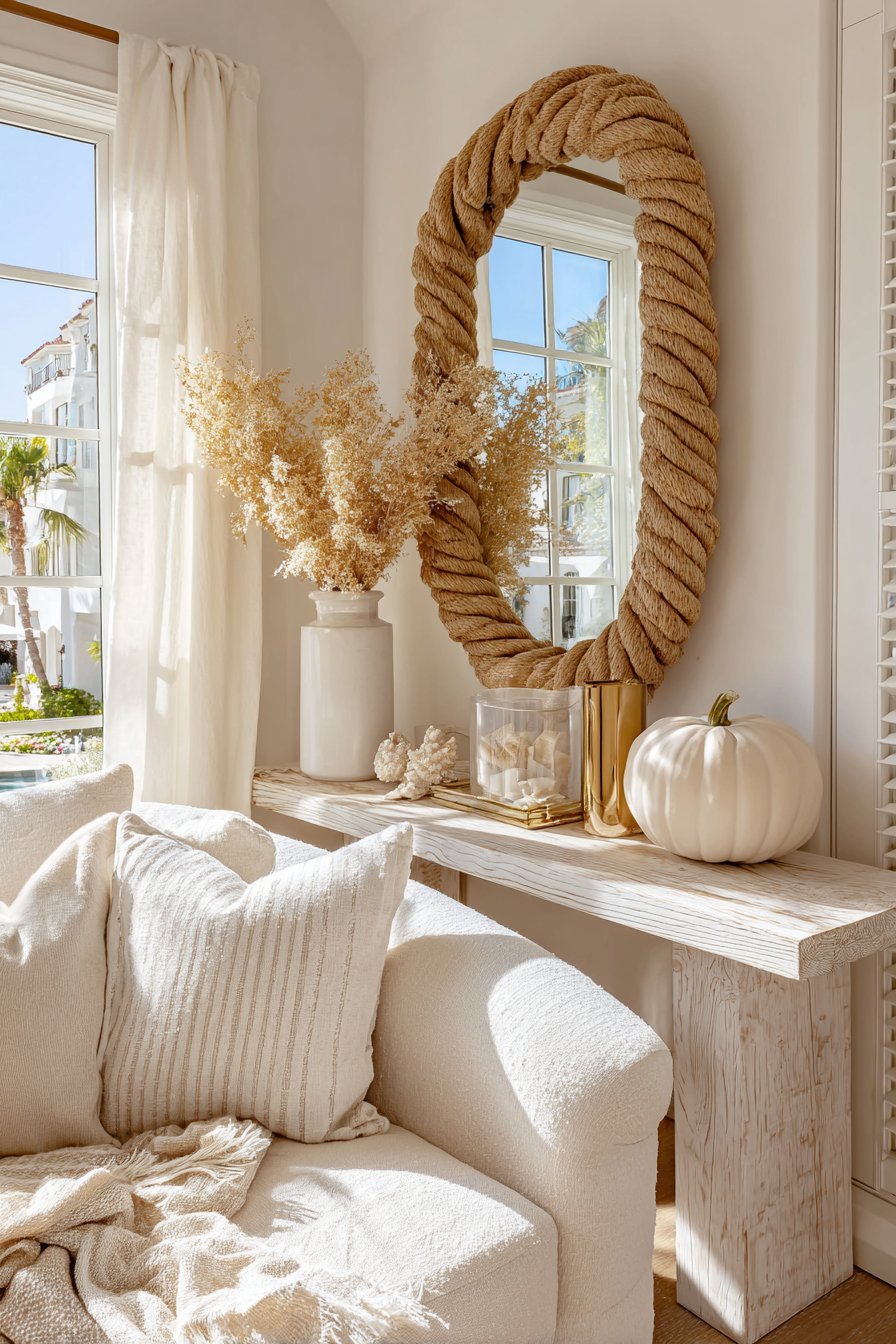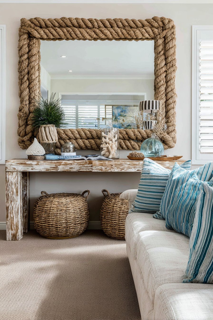 A large rope-wrapped mirror in natural jute fiber creates an organic coastal texture. Above a whitewashed driftwood console table, the mirror anchors beach-inspired design. The mirror reflects striped linen upholstery and coral accessories. Nautical brass accents catch and reflect light.