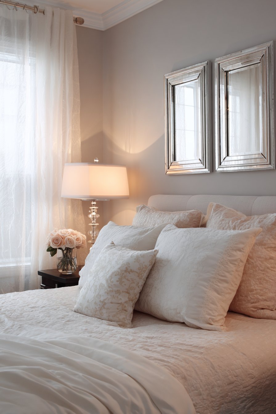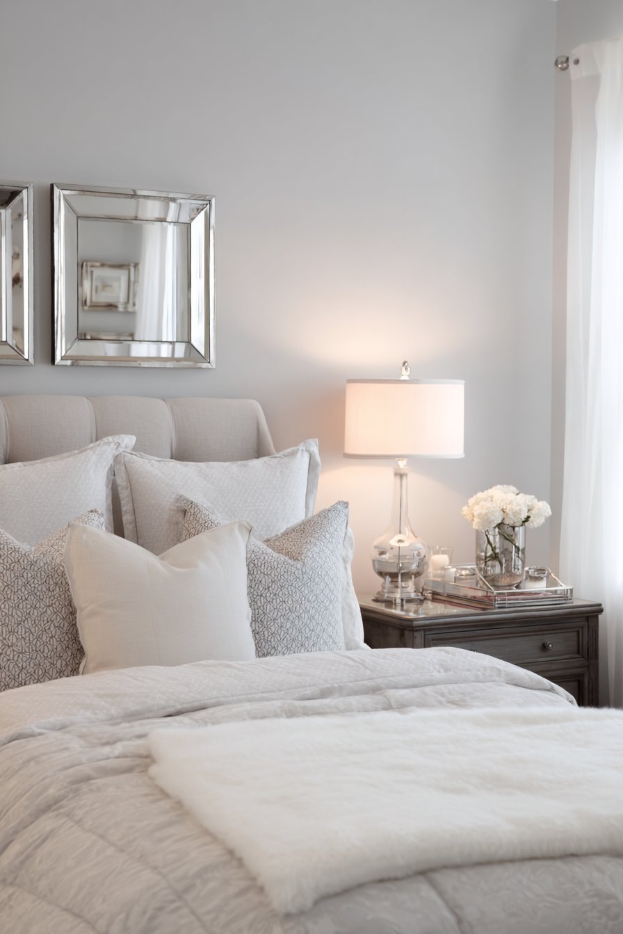 Matching rectangular mirrors in champagne silver frames flank an upholstered headboard symmetrically. Each mirror reflects a table lamp with silk shade creating balanced illumination. The paired arrangement creates visual rhythm and harmony. Soft grey walls and white bedding provide an elegant neutral foundation.