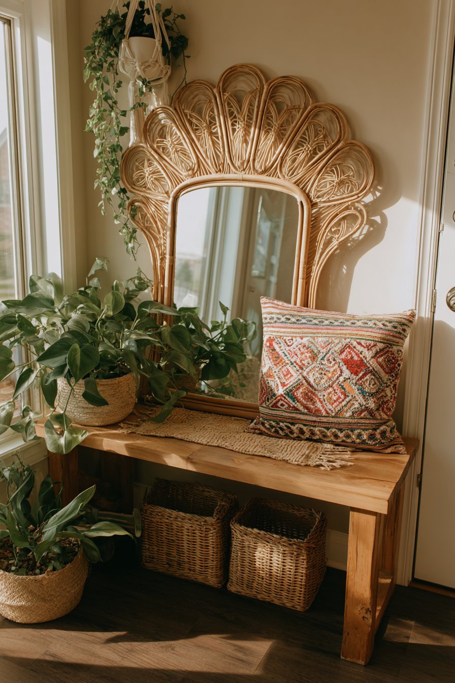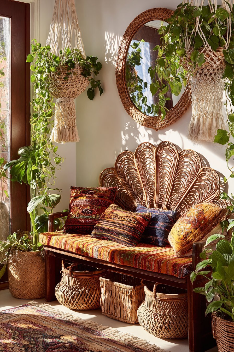 A vintage peacock-style wicker mirror features intricate rattan weaving in distinctive fan shape. The natural brown tones create an artisan focal point. Above a reclaimed wood bench with colorful textile cushions, the mirror anchors bohemian entryway. Macramé plant hangers and trailing pothos create lush backdrop.