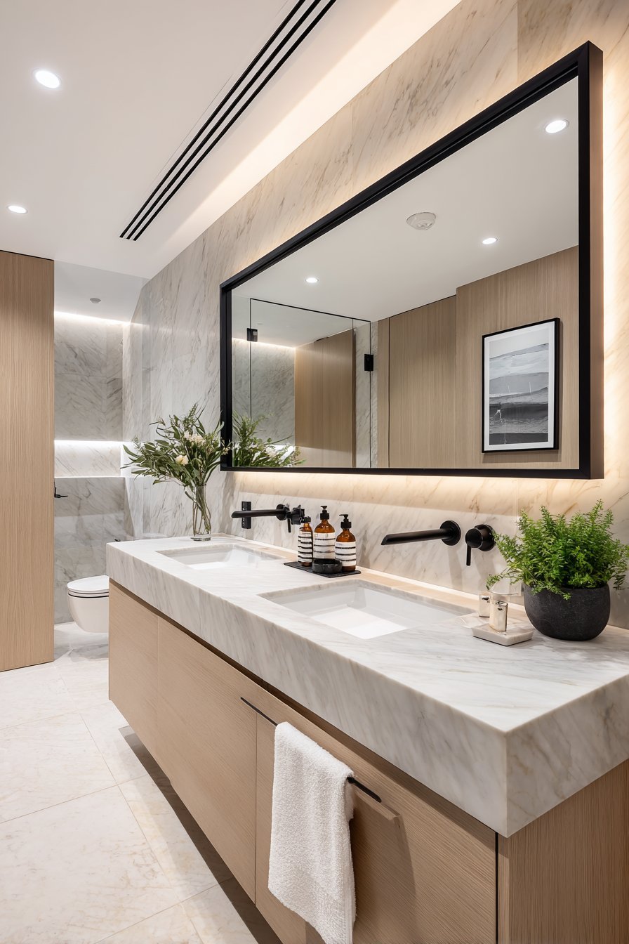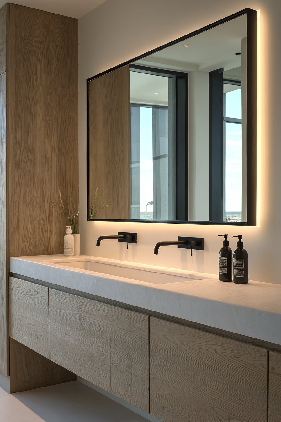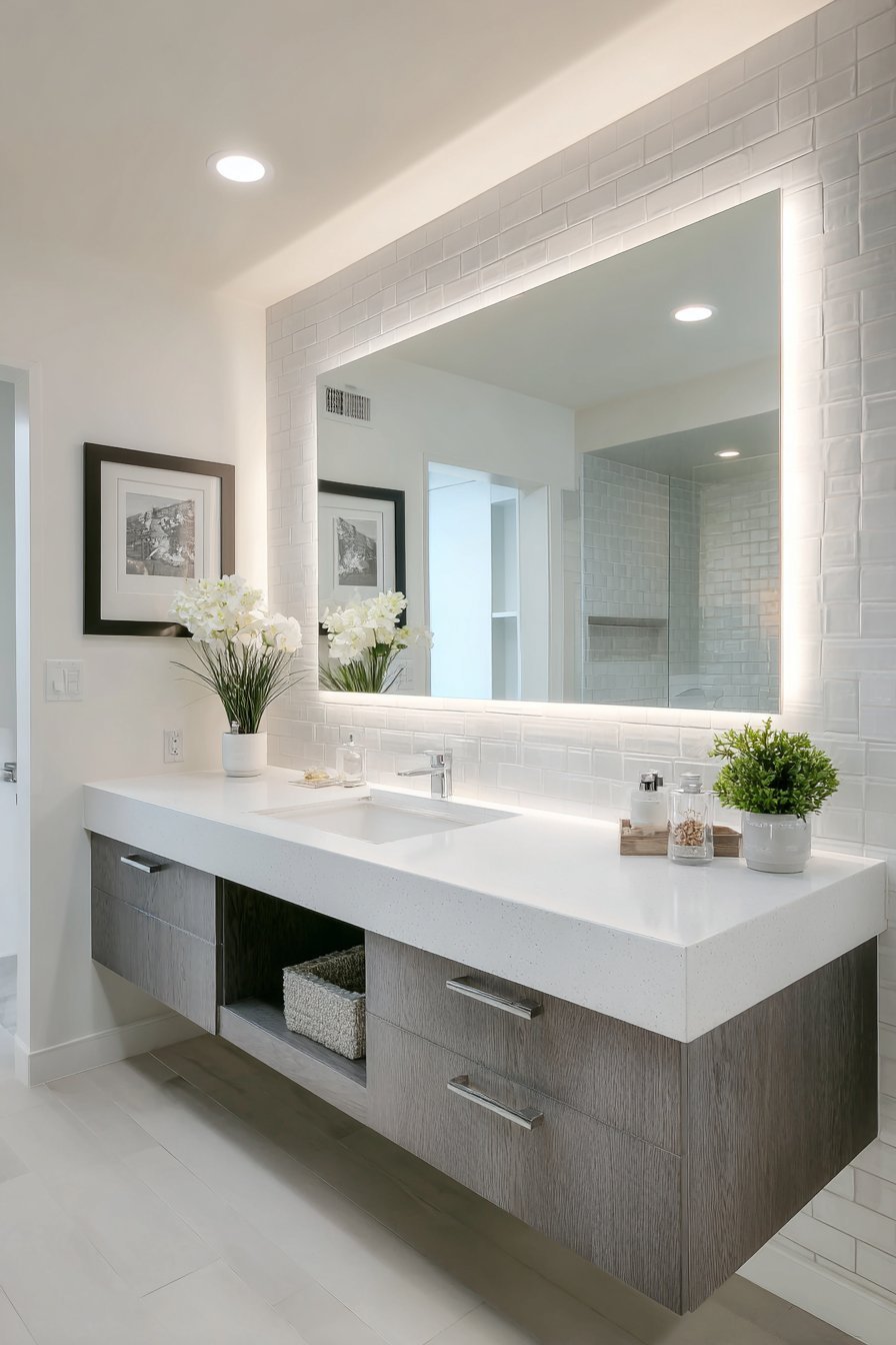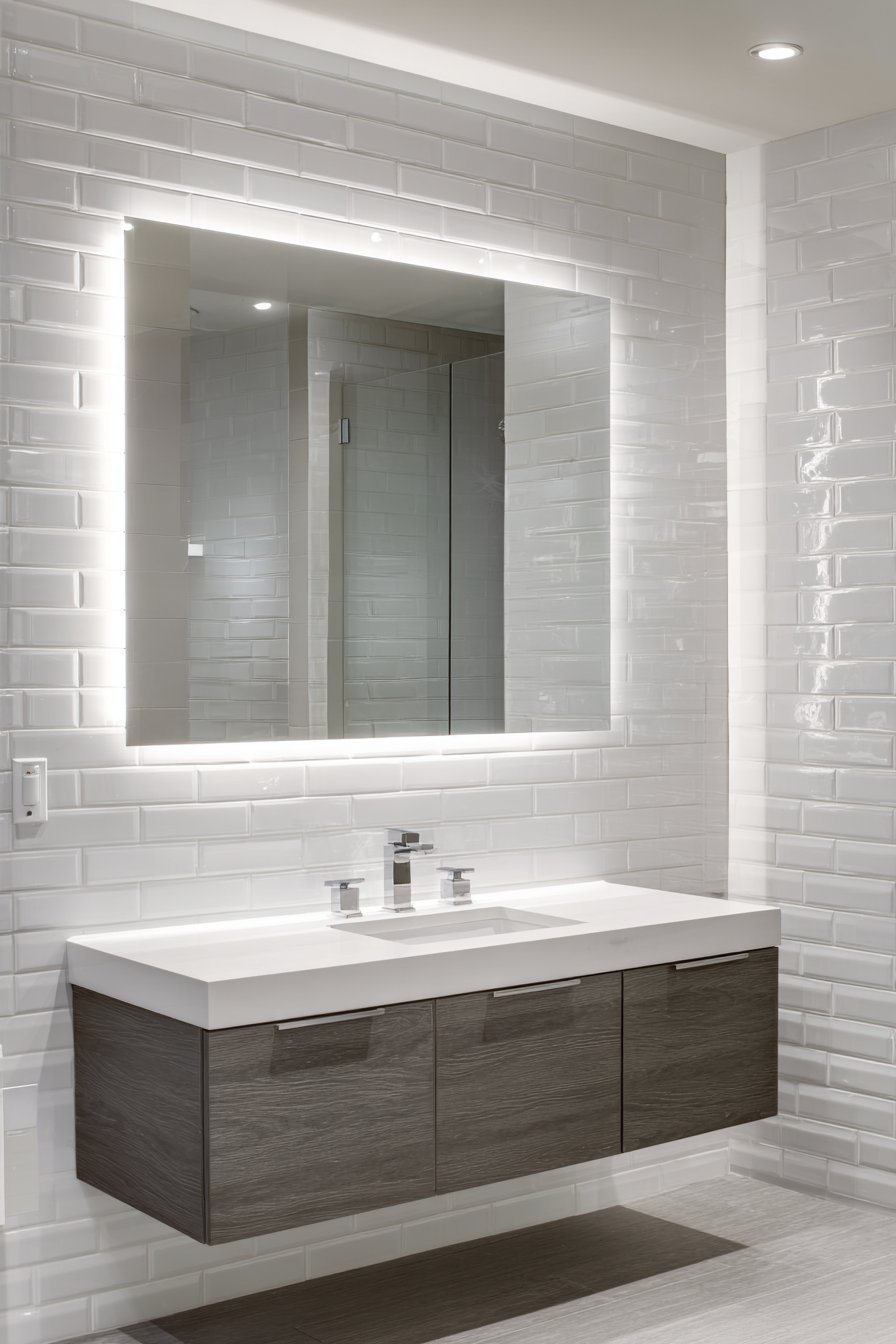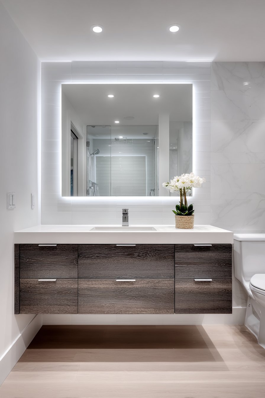 Contemporary design integrates technology seamlessly. The backlit mirror provides superior task lighting. Floating elements create visual lightness. Modern functionality merges with aesthetic minimalism.