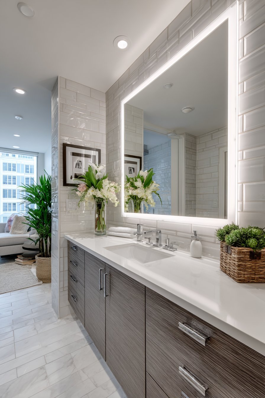 A seamless LED-backlit mirror appears to float against white subway tile wall. The modern mirror features illuminated perimeter that provides even, shadow-free lighting. Above a floating vanity in grey-stained oak, the design maintains contemporary cleanliness. Chrome fixtures and white quartz countertop complete the aesthetic.