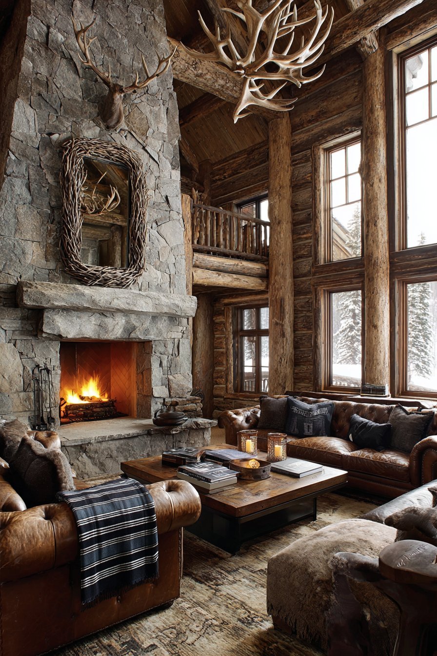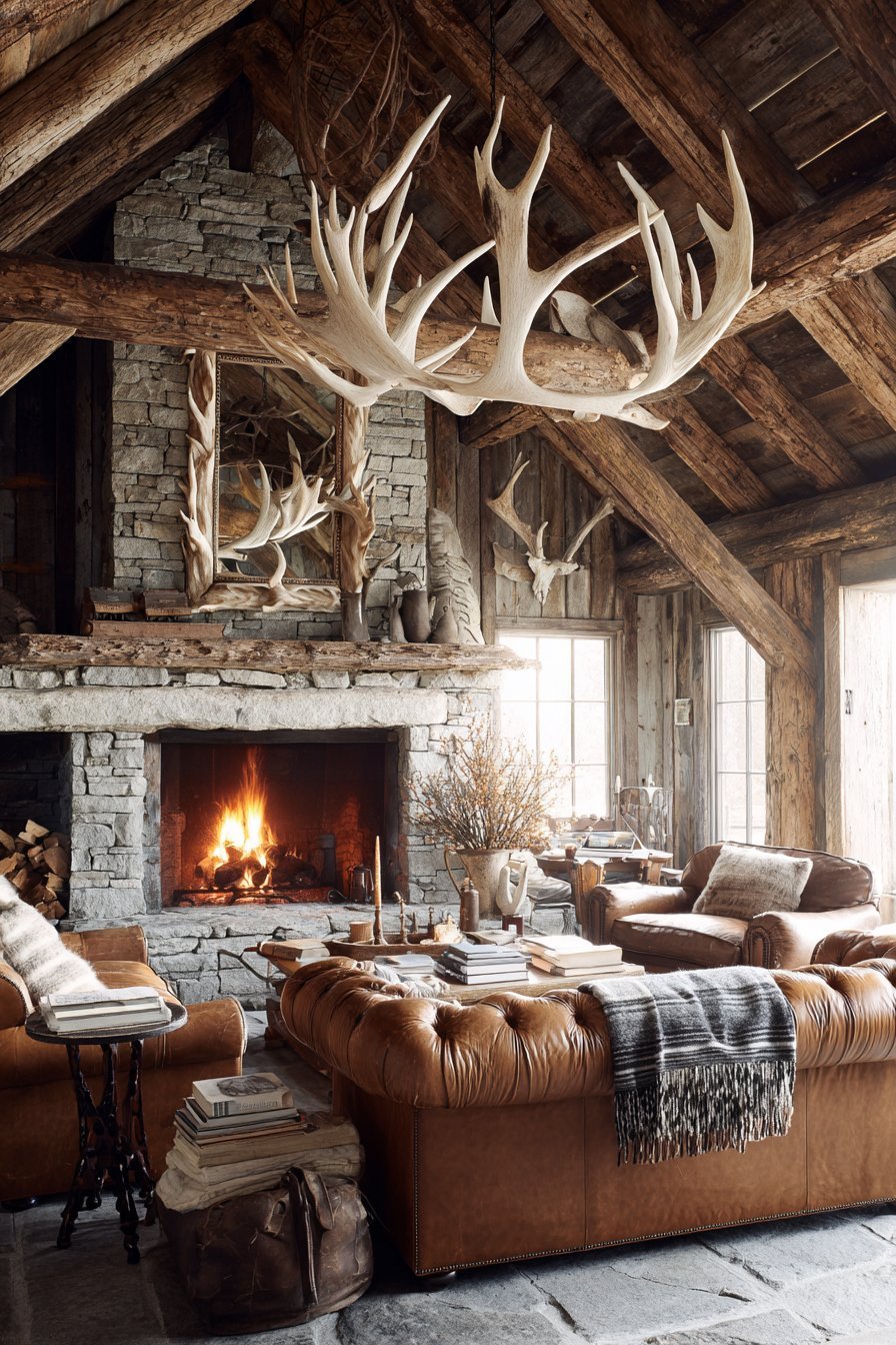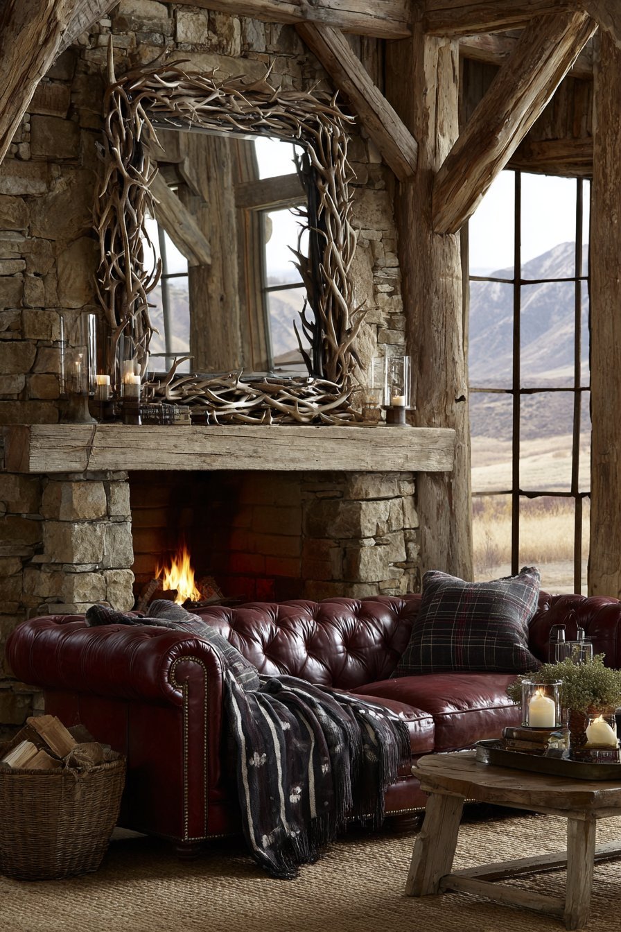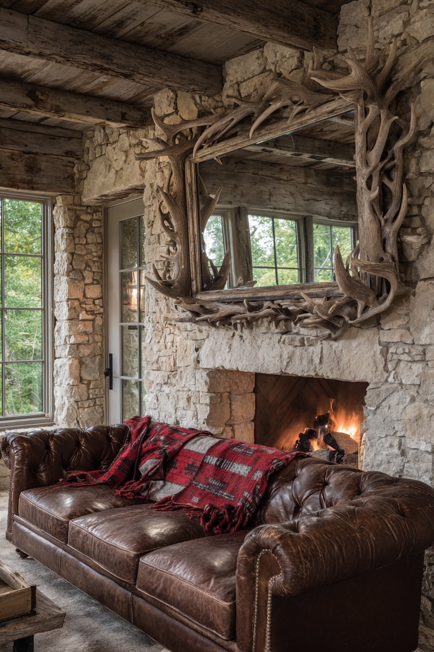 A large antler-framed mirror creates striking focal point above stone fireplace mantel. Natural shed antlers form an organic frame around reflective surface. The mirror reflects leather Chesterfield sofa and Pendleton wool blankets. Rough-hewn wood beams and stone walls provide an authentic lodge atmosphere.
