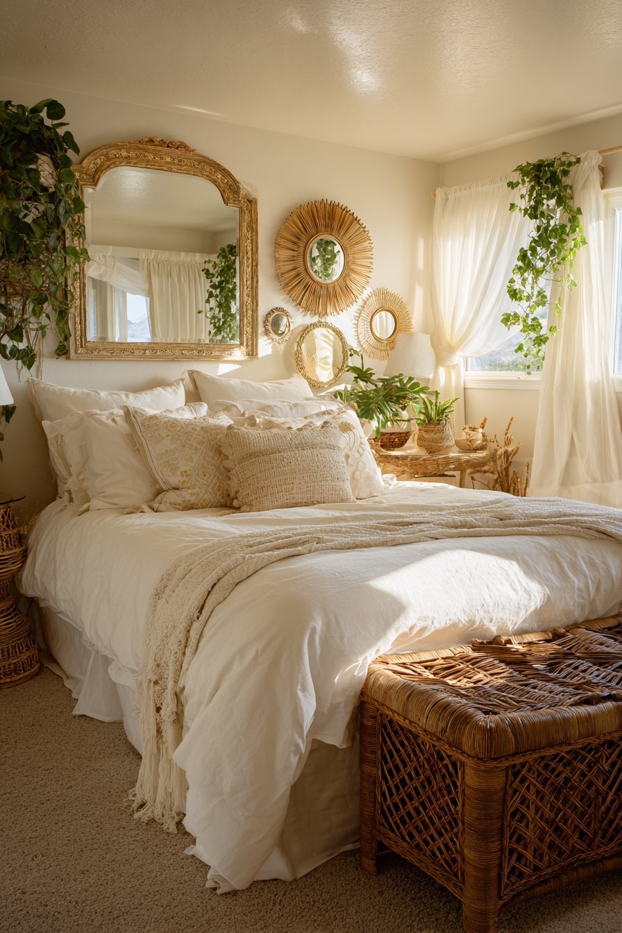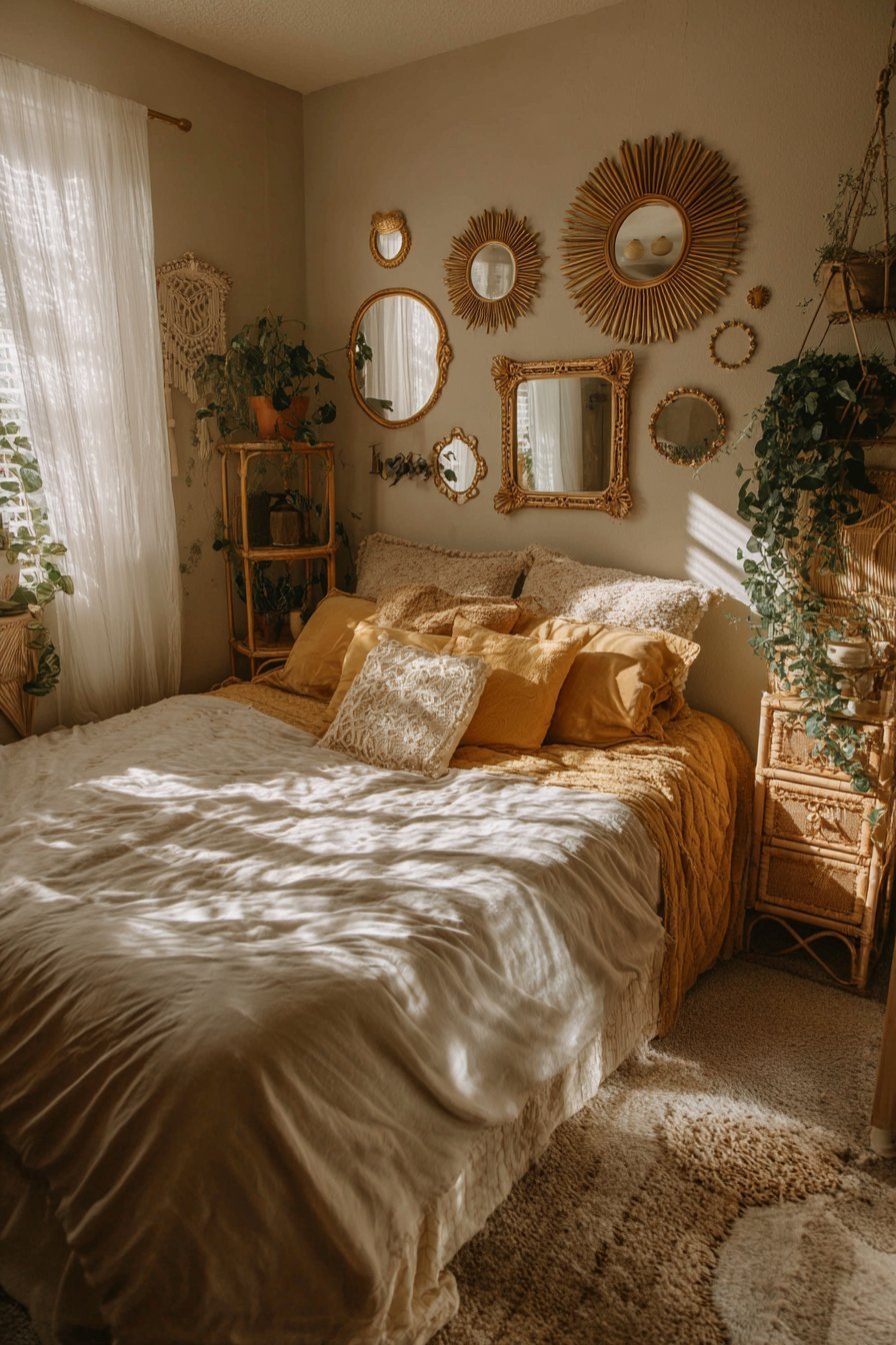 3. Vintage Mirror Gallery Wall in Bohemian Bedroom