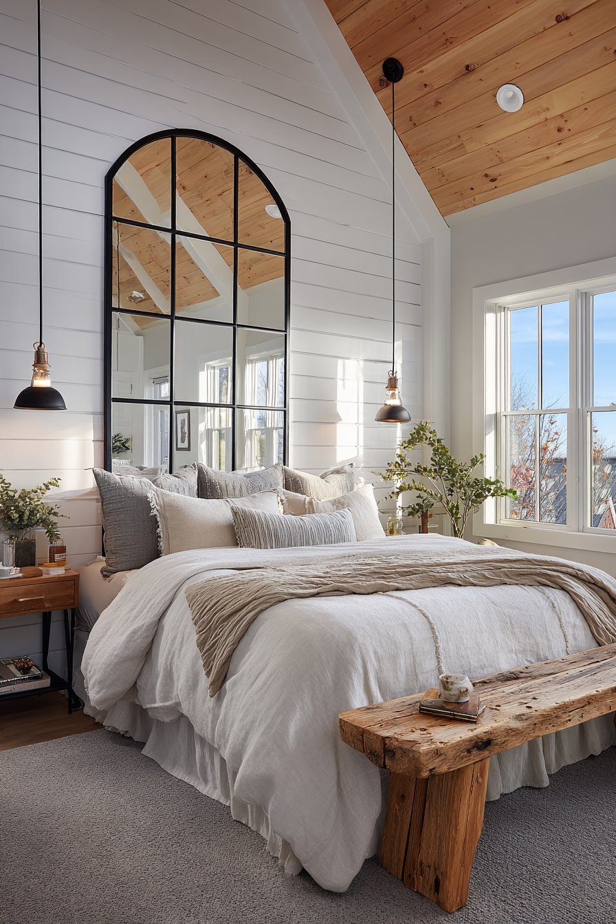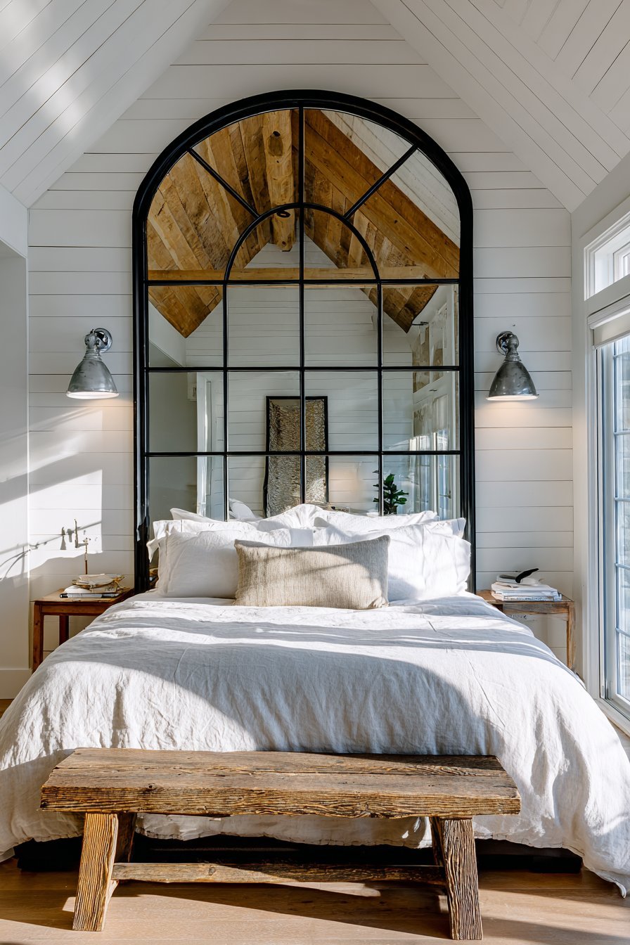 A tall arched windowpane-style mirror features multiple panes divided by thin black metal mullions. The architectural design references traditional windows. Above the bed, the mirror reflects white shiplap walls and wooden beam ceiling. Industrial-style pendant lights appear in the segmented reflection.