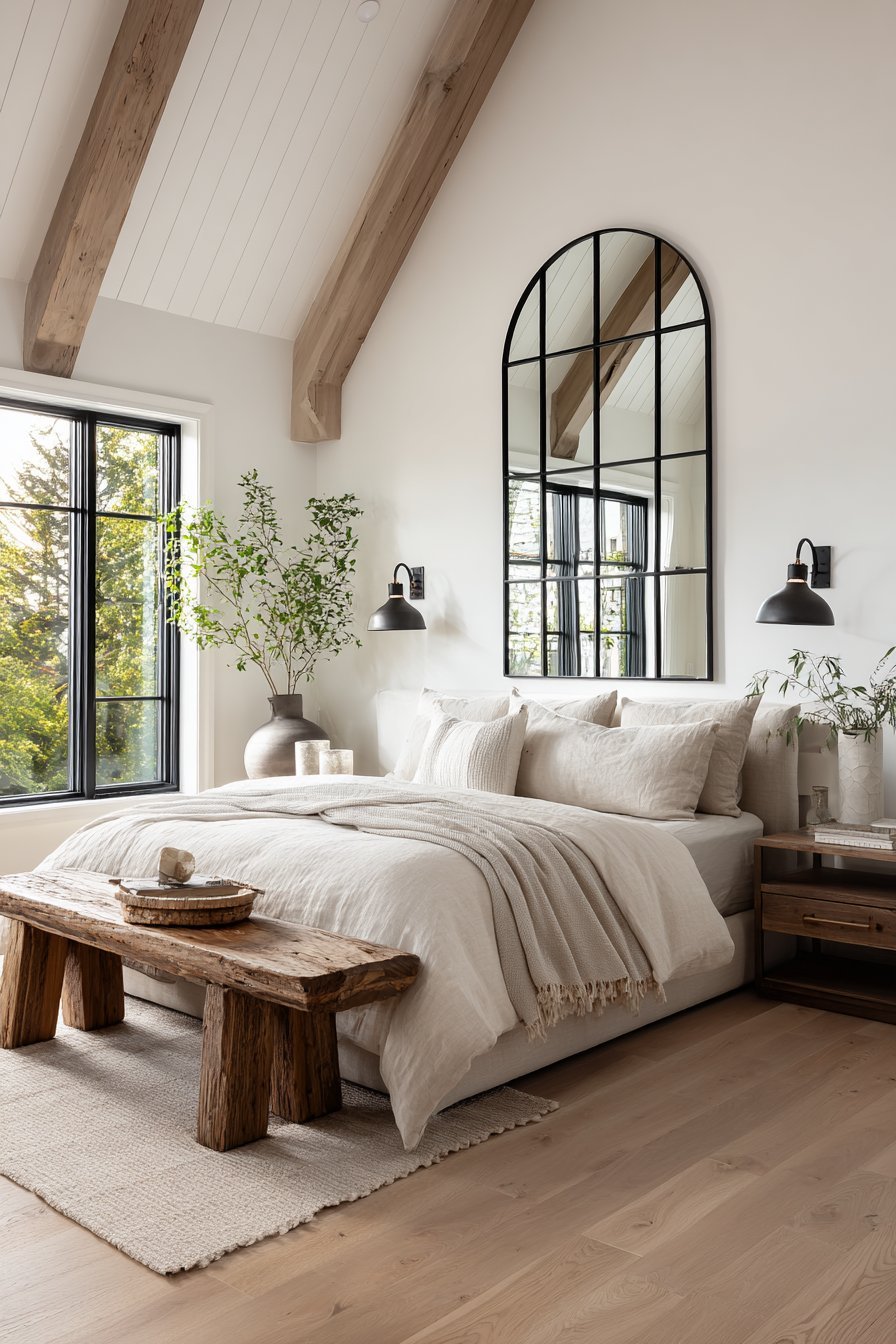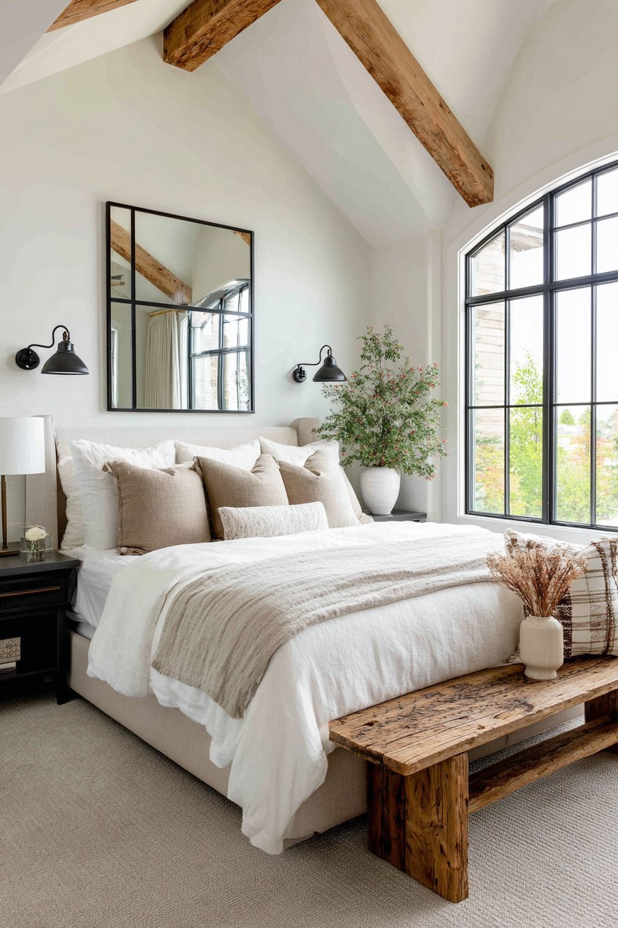 Linen bedding in natural tones and reclaimed wood bench complete modern rustic aesthetic. Soft morning light through nearby windows creates bright multi-faceted reflections. The divided panes create visual pattern and interest. Modern farmhouse style balances rustic and contemporary elements.