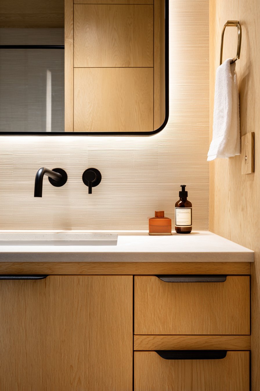 - Select natural materials like oak and ceramic to add warmth to minimal designs