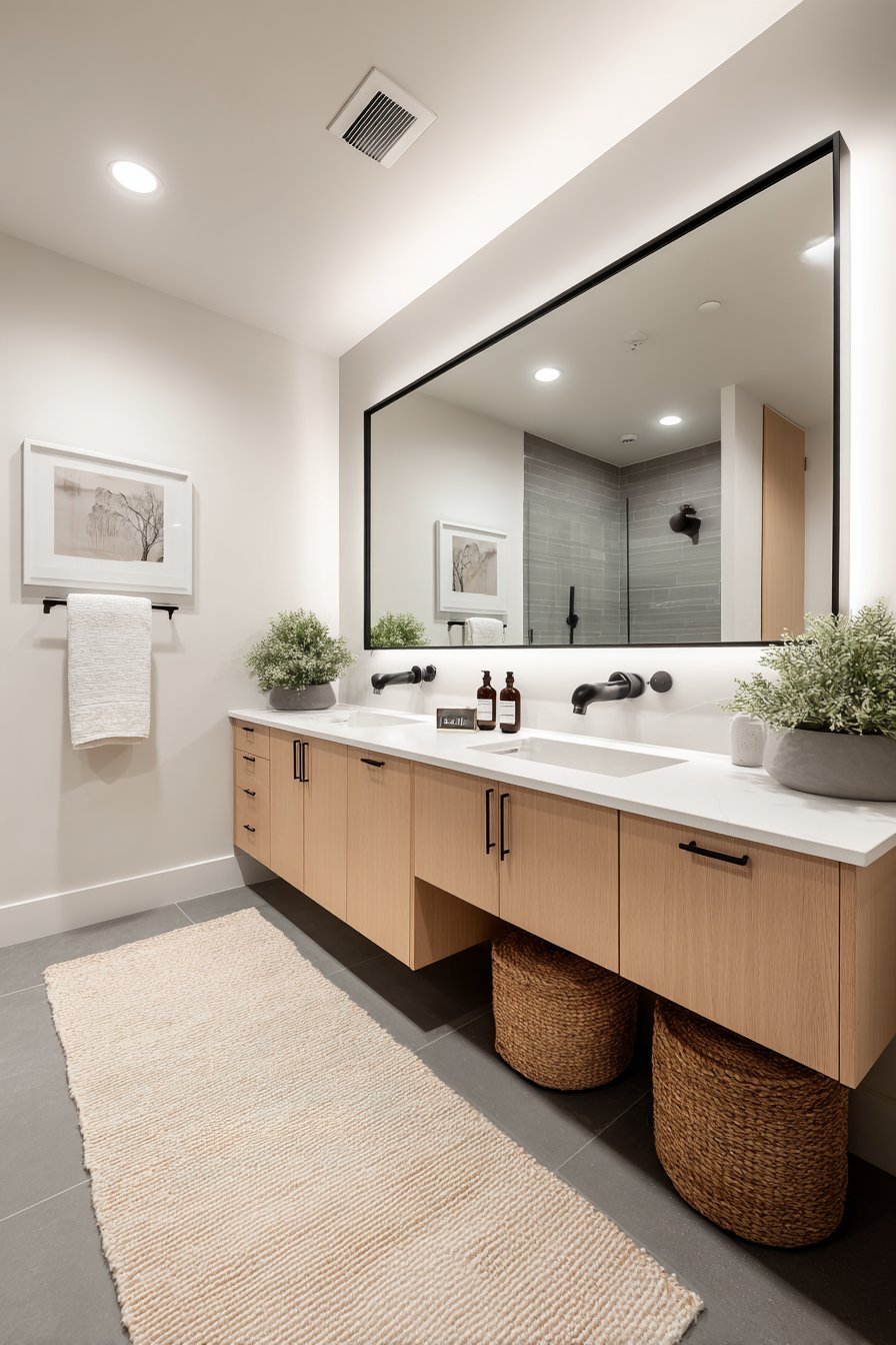 The mirror hangs above a floating double vanity in white oak. Matte black fixtures create striking contrast against the light wood. White surfaces maintain the clean, uncluttered atmosphere. The LED lighting provides shadow-free illumination ideal for grooming tasks.