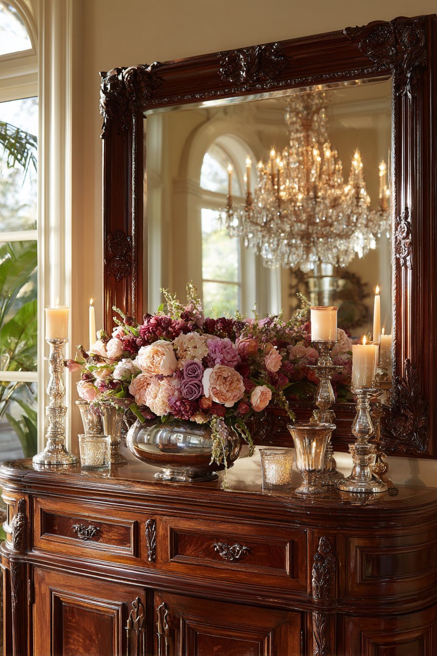 Silver candlesticks and a floral arrangement on the buffet appear both directly and in reflection. The mirror multiplies decorative elements without adding physical clutter. Natural light from adjacent windows combines with chandelier illumination. The reflections create layered lighting effects throughout the space.