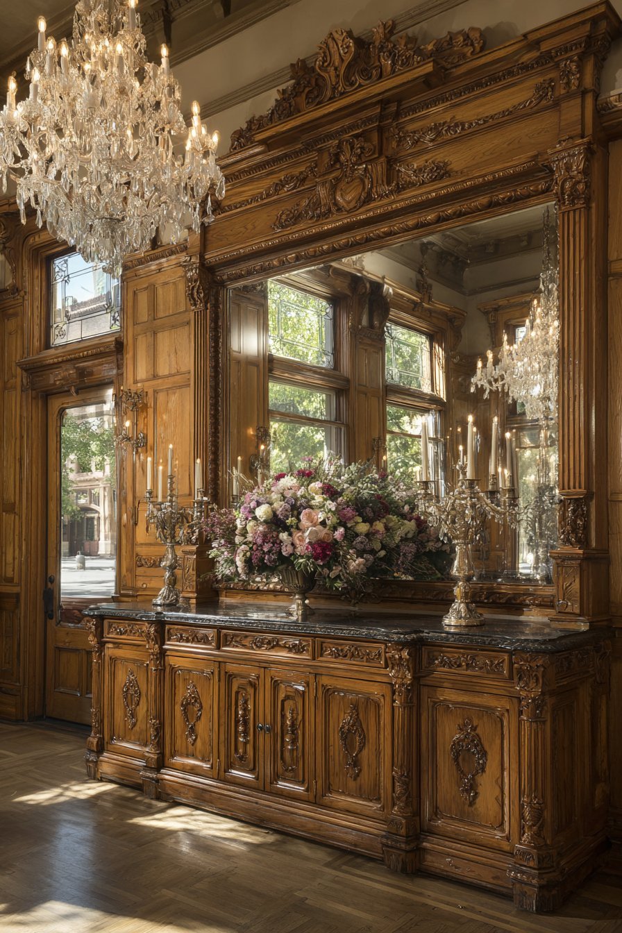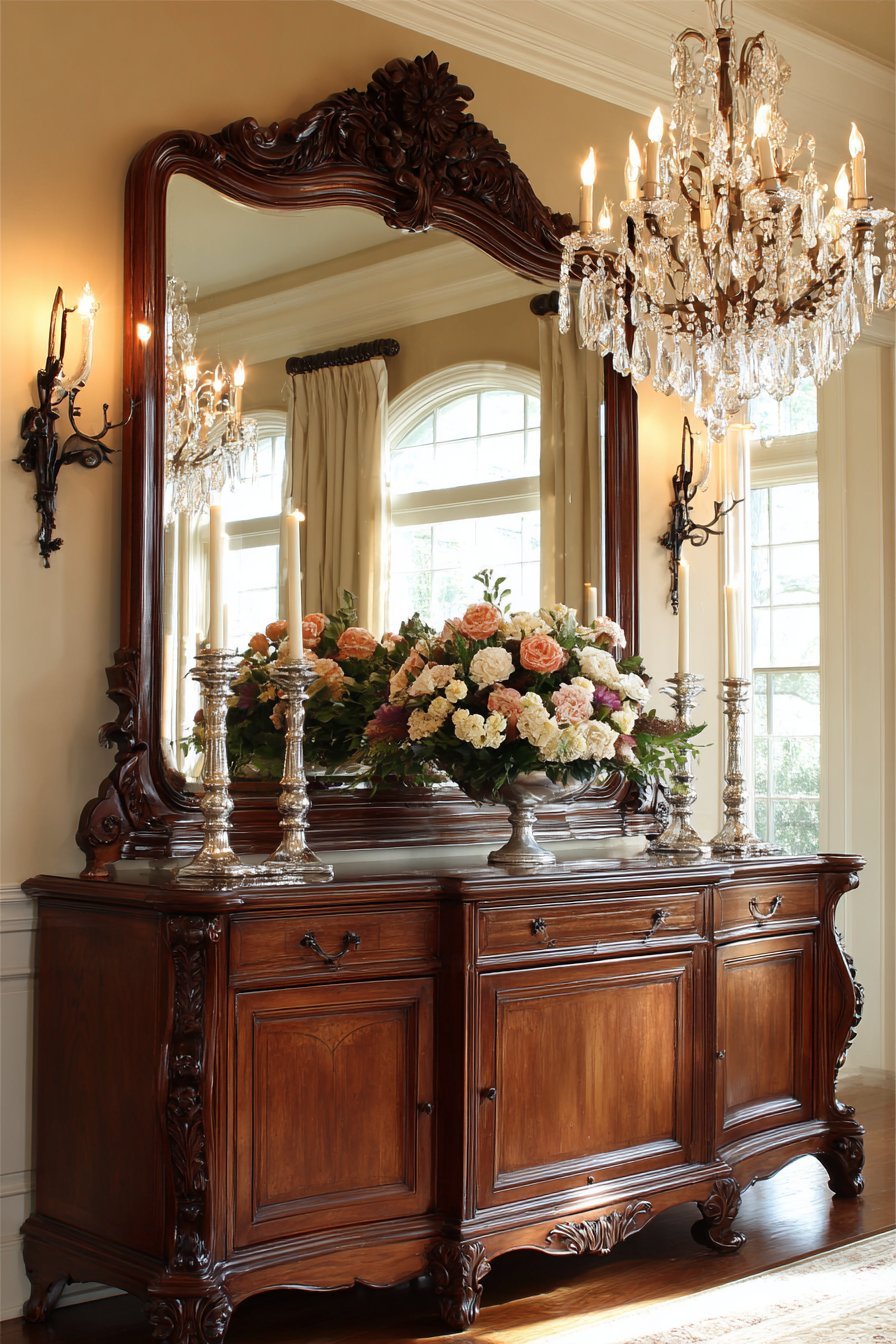 A substantial rectangular mirror with an ornate carved mahogany frame anchors a traditional dining room. The deep wood finish exudes formal elegance. Positioned above a sideboard buffet, the mirror reflects an elegant chandelier. This strategic placement effectively doubles the chandelier’s visual impact.
