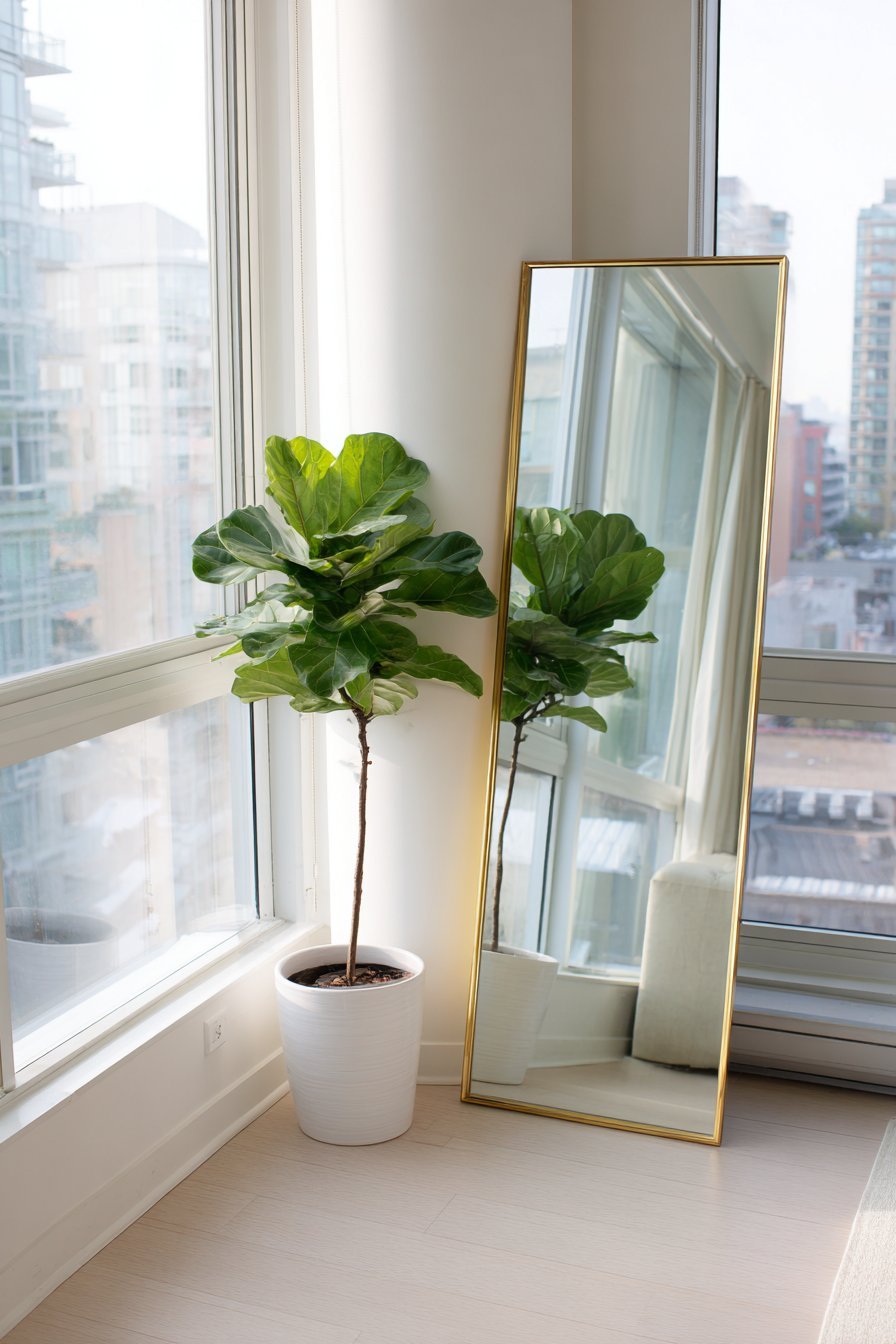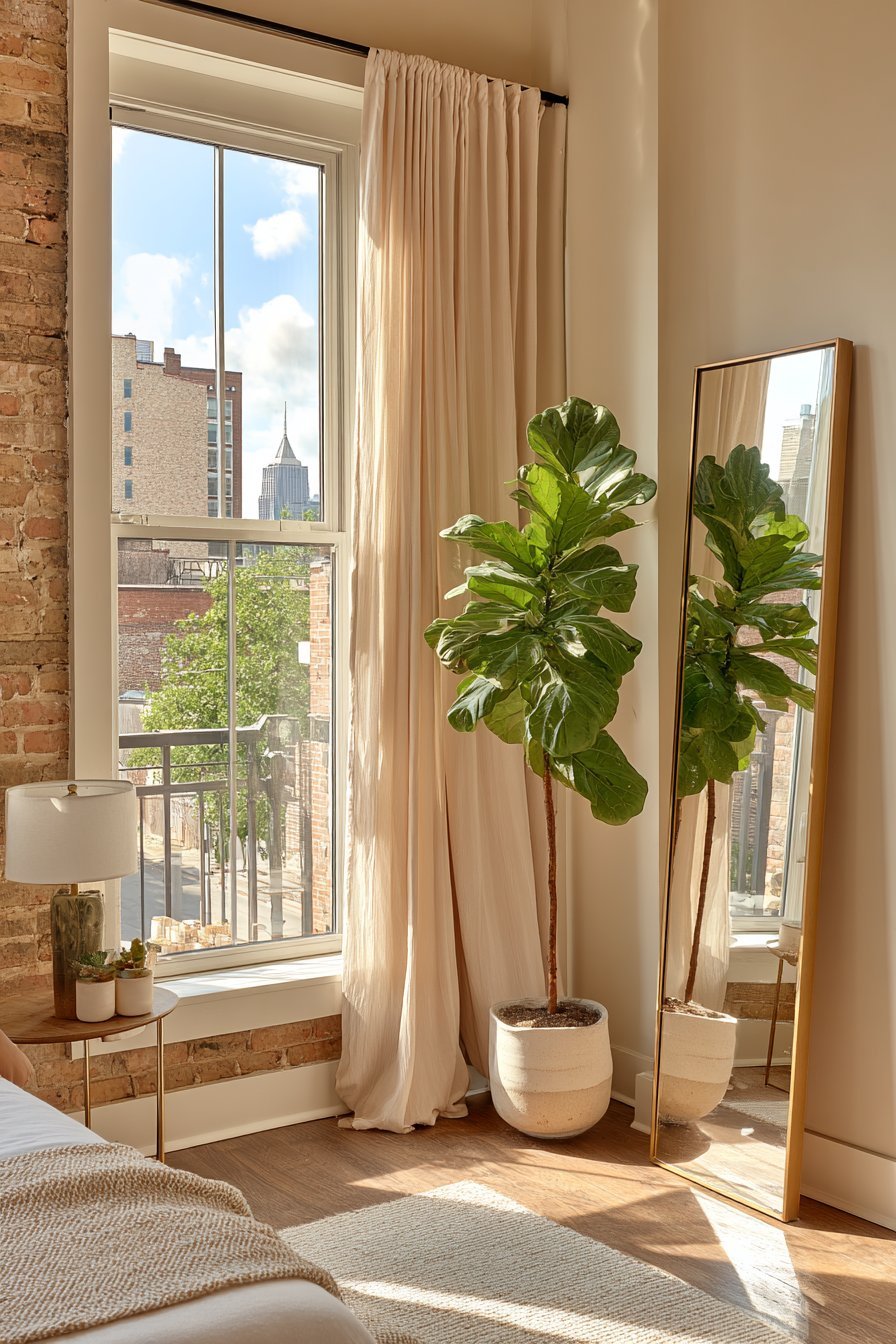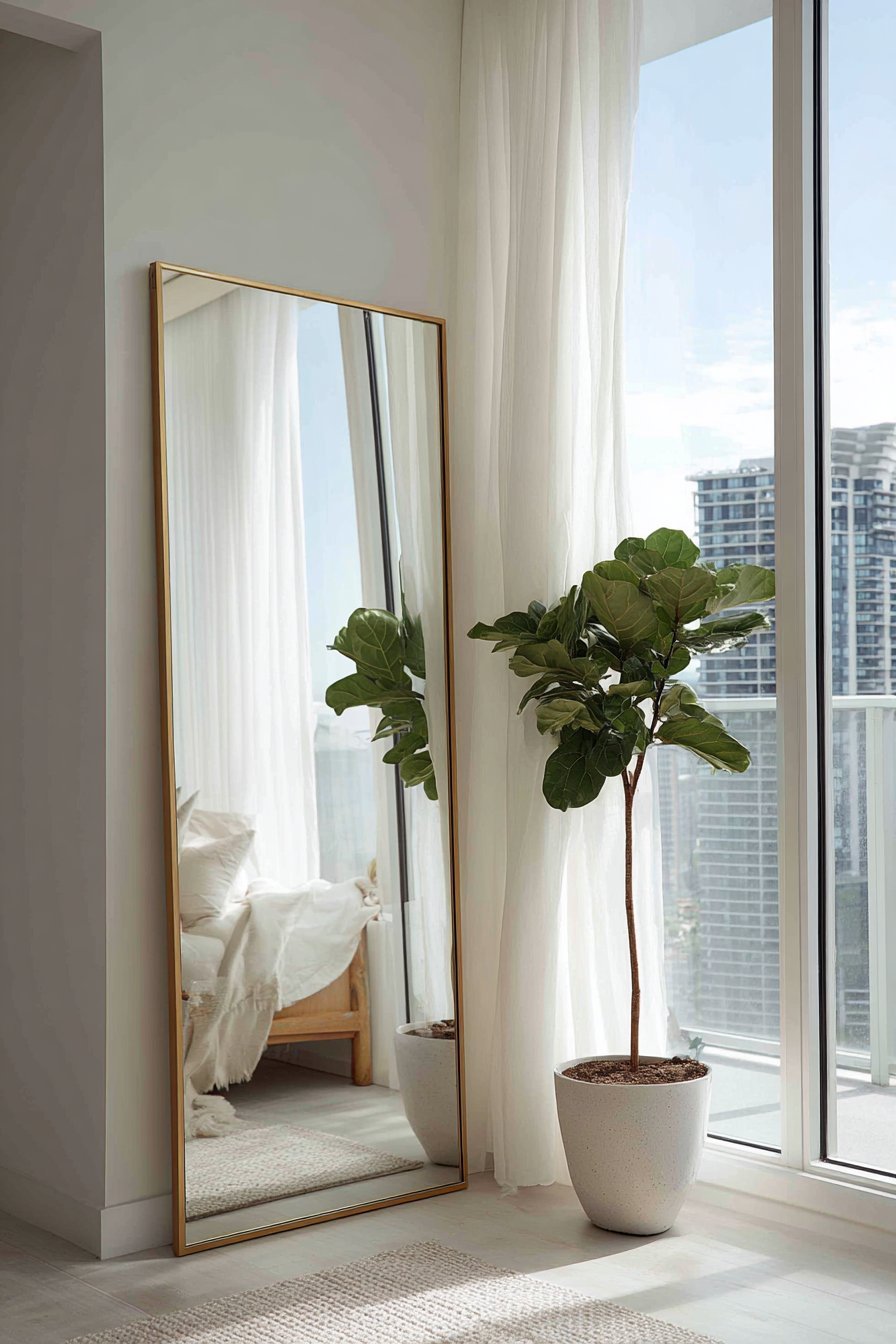 A full-length leaning mirror with a thin brass frame maximizes space perception in a studio apartment. The floor mirror rests in a corner, reflecting the room’s entire layout. This placement visually expands the compact area while serving practical functions. A small potted fiddle leaf fig sits beside the mirror base.