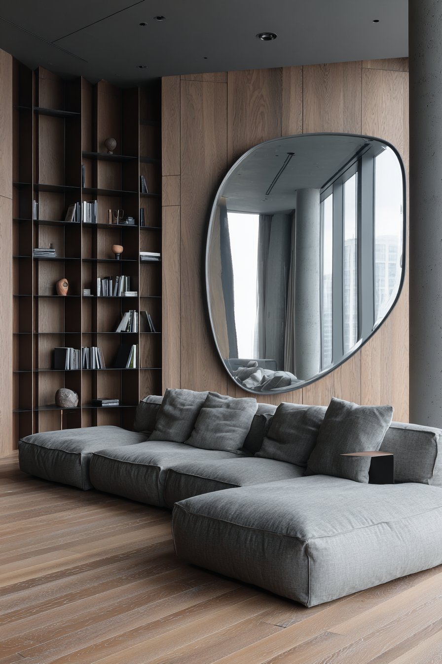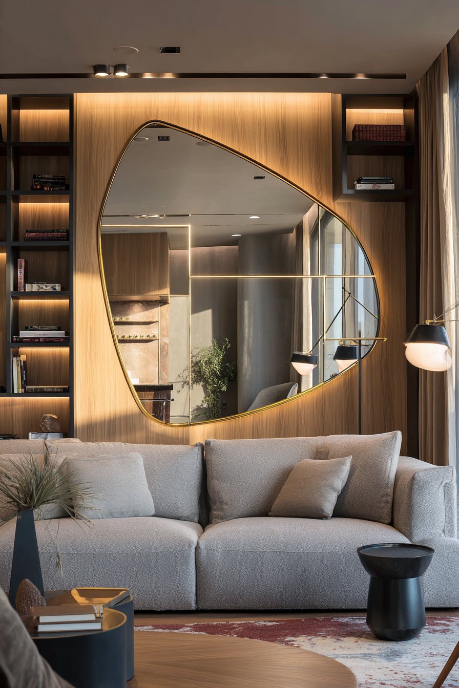 Recessed lighting creates subtle highlights on the mirror’s unique form. The organic shape contrasts beautifully with the room’s geometric furniture. This piece blurs the line between functional mirror and artistic sculpture. Its reflection fragments the room into interesting abstract compositions.