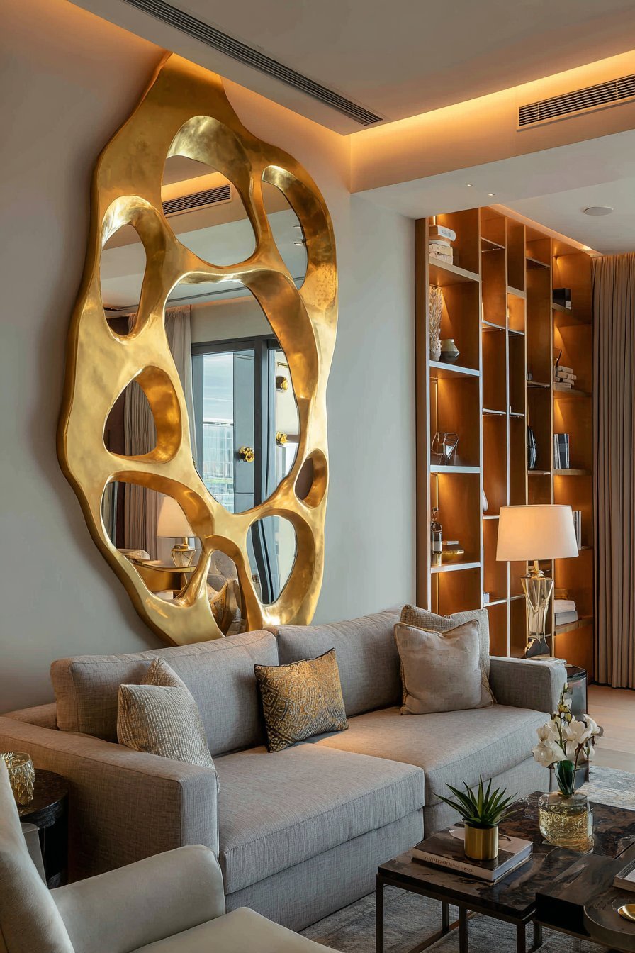 An irregular-shaped mirror with an abstract sculptural brass frame functions as wall art. The asymmetric design creates visual interest above a low-profile grey linen sofa. Brushed brass finish adds contemporary sophistication. The mirror reflects portions of mid-century modern furniture and built-in shelving.