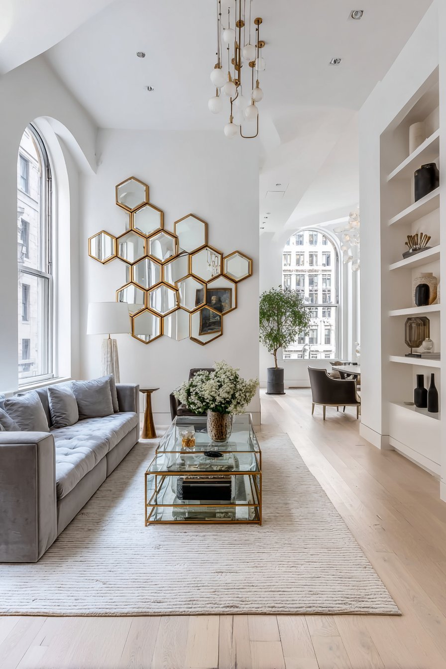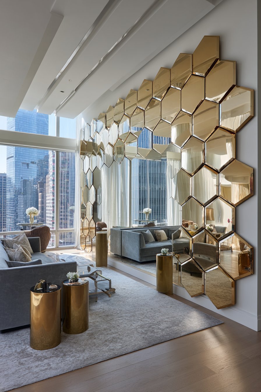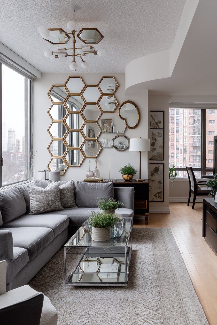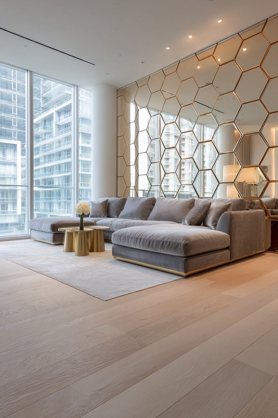 A large geometric frameless mirror arrangement dominates the main wall in this contemporary space. Hexagonal mirror tiles create an intricate honeycomb pattern. The arrangement reflects abundant natural light from adjacent floor-to-ceiling windows. This amplifies the sense of spaciousness dramatically.